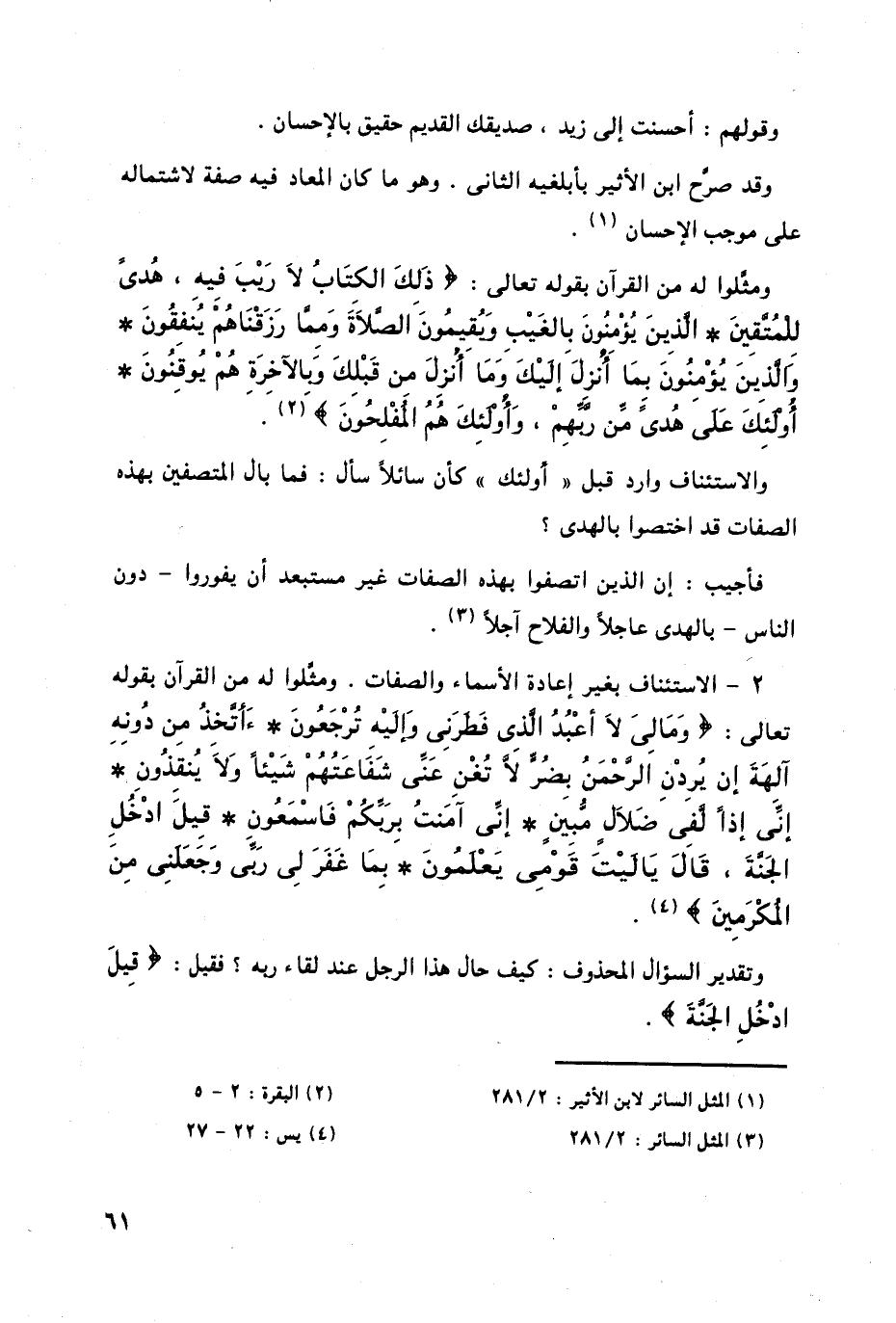 ومثَّلوا له من القرآن بقوله تعالى: (ذَلِكَ الْكِتَابُ لَا رَيْبَ فِيهِ هُدًى لِلْمُتَّقِينَ (2) الَّذِينَ يُؤْمِنُونَ بِالْغَيْبِ وَيُقِيمُونَ الصَّلَاةَ وَمِمَّا رَزَقْنَاهُمْ يُنْفِقُونَ (3) وَالَّذِينَ يُؤْمِنُونَ بِمَا أُنْزِلَ إِلَيْكَ وَمَا أُنْزِلَ مِنْ قَبْلِكَ وَبِالْآخِرَةِ هُمْ يُوقِنُونَ (4) أُولَئِكَ عَلَى هُدًى مِنْ رَبِّهِمْ وَأُولَئِكَ هُمُ الْمُفْلِحُونَ (5) .