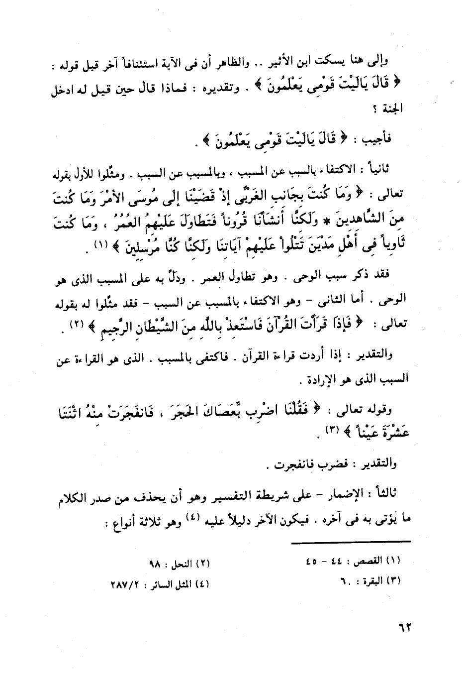 ثانياً: الاكتفاء بالسبب عن المسبب، وبالمسبب عن السبب. ومثَّلوا للأول بقوله تعالى: (وَمَا كُنْتَ بِجَانِبِ الْغَرْبِيِّ إِذْ قَضَيْنَا إِلَى مُوسَى الْأَمْرَ وَمَا كُنْتَ مِنَ الشَّاهِدِينَ (44) وَلَكِنَّا أَنْشَأْنَا قُرُونًا فَتَطَاوَلَ عَلَيْهِمُ الْعُمُرُ وَمَا كُنْتَ ثَاوِيًا فِي أَهْلِ مَدْيَنَ تَتْلُو عَلَيْهِمْ آيَاتِنَا وَلَكِنَّا كُنَّا مُرْسِلِينَ (45) .
