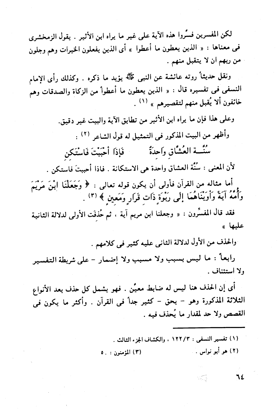 ونقل حديثاً روته عائشة عن النبي - صلى الله عليه وسلم - يؤيد ما ذكره. وكذلك رأى الإمام النسفي في تفسيره قال: " الذين يعطون ما أعطواً من الزكاة والصدقات وهم خائفون ألا يُقبل منهم لتقصيرهم ".