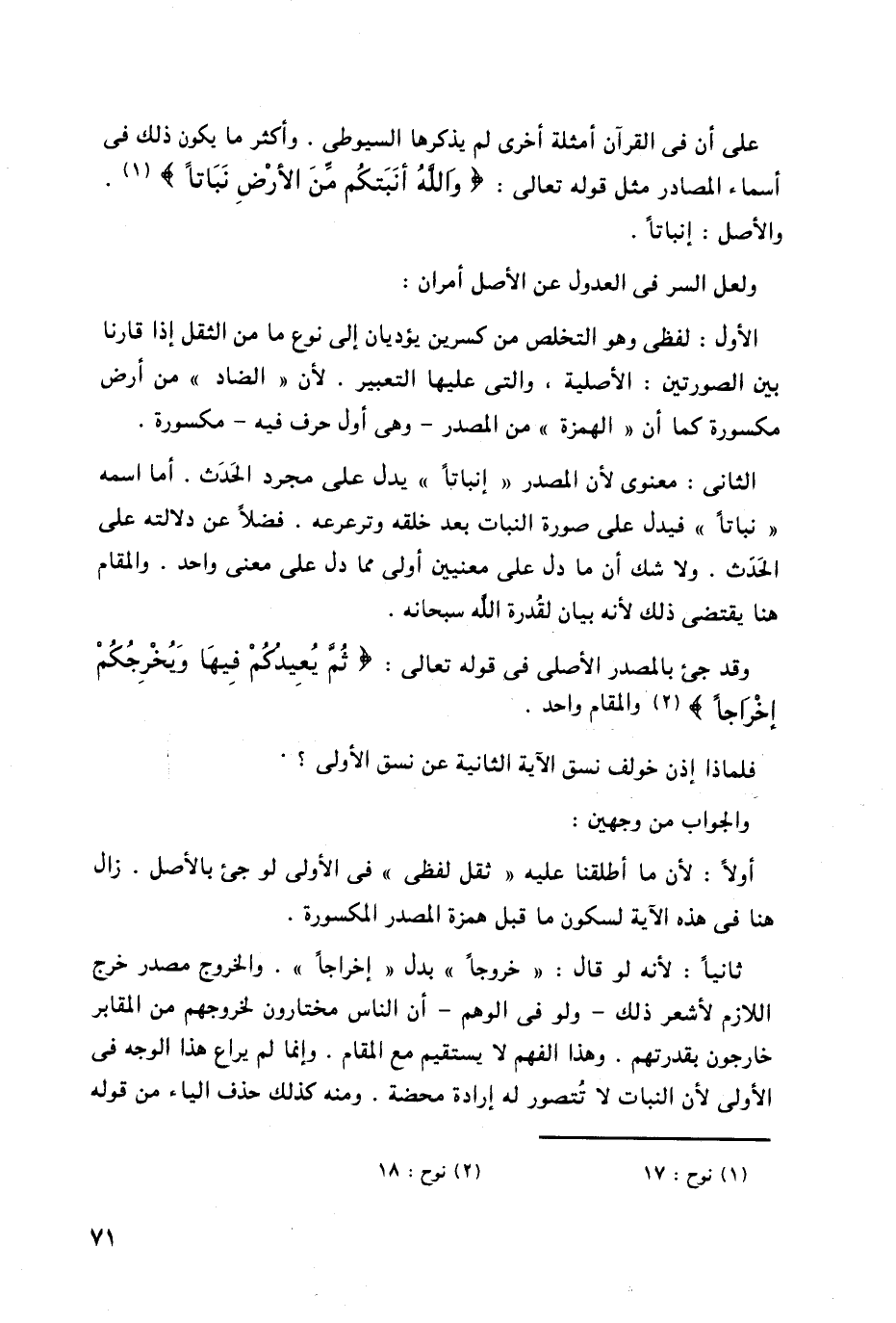 وأكثر ما يكون ذلك فى أسماء المصادر مثل قوله تعالى: (وَاللَّهُ أَنْبَتَكُمْ مِنَ الْأَرْضِ نَبَاتًا (17) .
