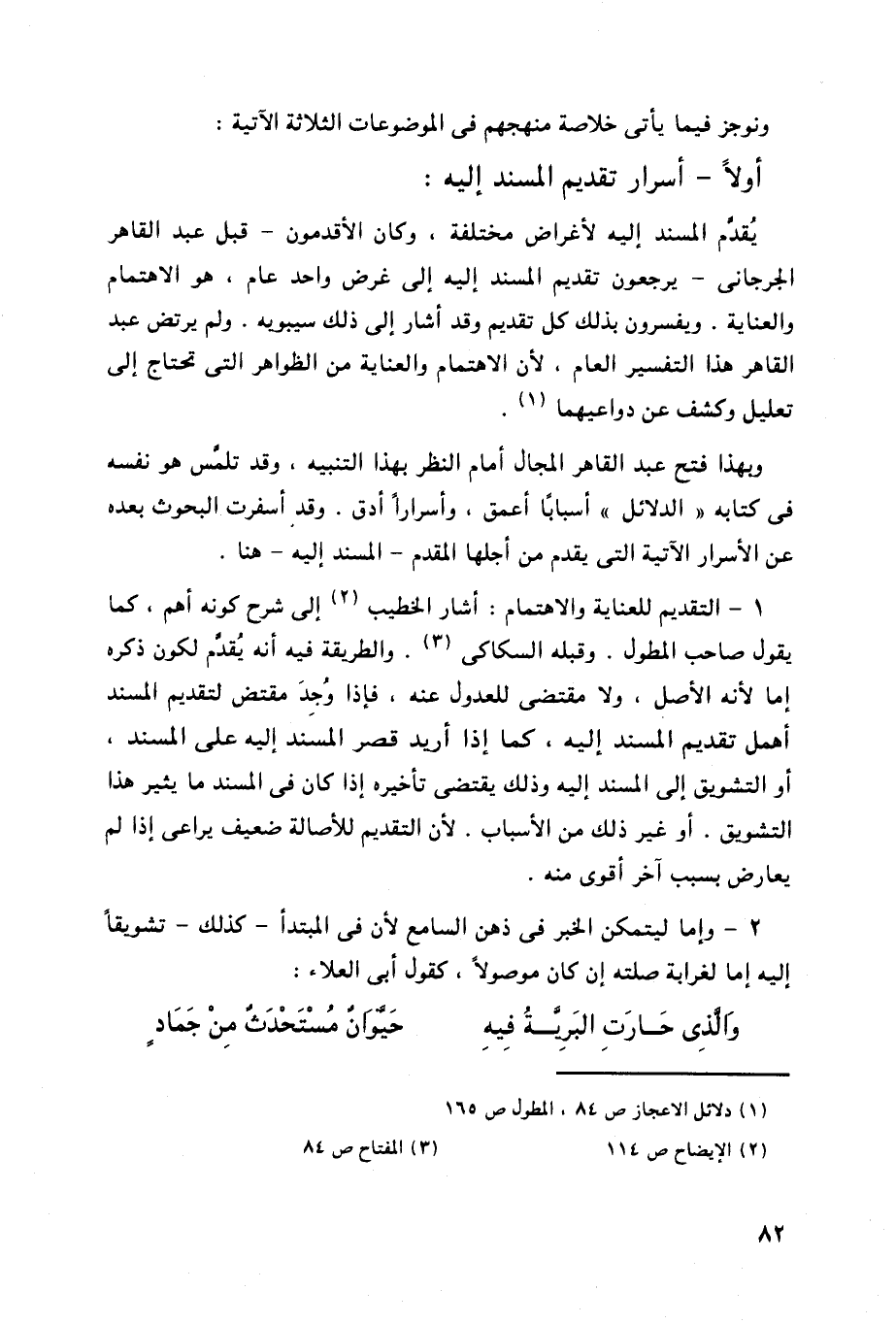 الجرجاني - يرجعون تقديم المسند إليه إلى غرض واحد عام، هو الاهتمام