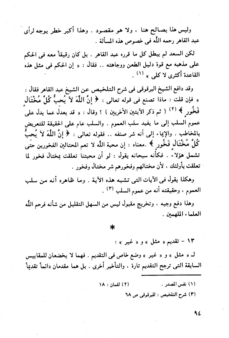 " فإن قلت: ماذا تصنع في قوله تعالى: (إِنَّ اللَّهَ لَا يُحِبُّ كُلَّ مُخْتَالٍ فَخُورٍ) (ثم ذكر الآيتين الأخريين) ؟