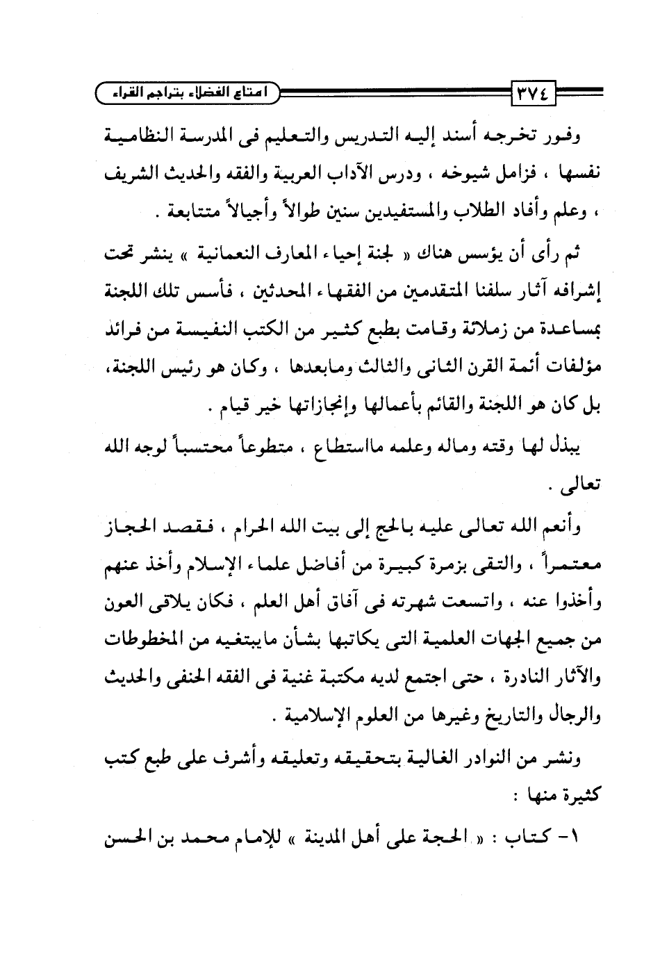 ثم رأى أن يؤسس هناك "لجنة إحياء المعارف النعمانية" ينشر تحت إشرافه آثار سلفنا المتقدمين من الفقهاء المحدثين، فأسس تلك اللجنة بمساعدة من زملائة وقامت بطبع كثير من الكتب النفيسة من فرائد مؤلفات أئمة القرن الثاني والثالث وما بعدها، وكان هو رئيس اللجنة، بل كان هو اللجنة والقائم بأعمالها وإنجازاتها خير قيام.