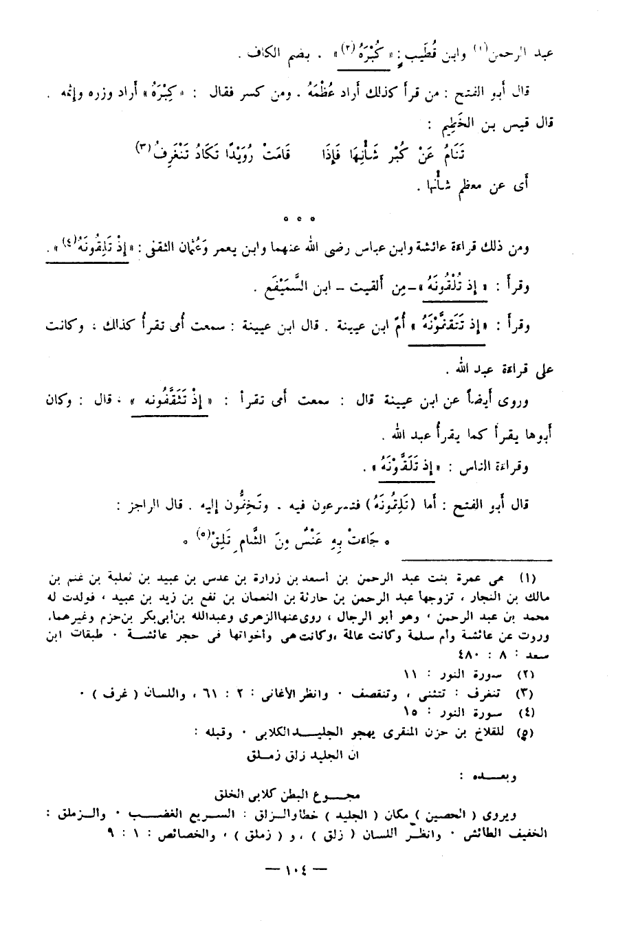 قال أبو الفتح: أما "تَلِقُونَهُ" فتسرعون فيه، وتَخِفُّون إليه. قال الزاجر: