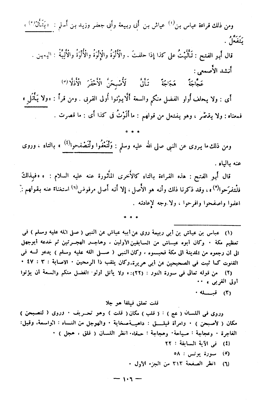 قال أبو الفتح: هذه القراءة بالتاء كالأخرى المأثورة عنه عليه السلام: "فَبِذَلِكَ فَلْتَفْرَحُوا"5، وقد ذكرنا ذلك وأنه هو الأصل، إلا أنه أصل مرفوض6 استغناءً عنه بقولهم: اعفوا واصفحوا وافرحوا، ولا وجه لإعادته.