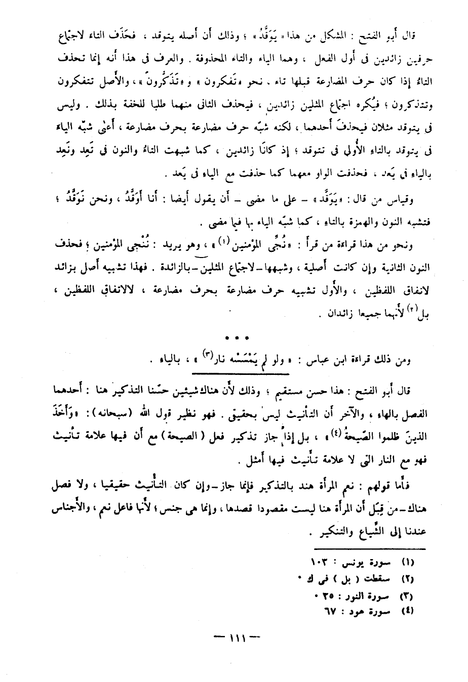 قال أبو الفتح: المشكل من هذا "يَوَقَّدُ"؛ وذلك أن أصله يتوقد، فحذف التاء لاجتماع حرفين زائدين في أول الفعل، وهما الياء والتاء المحذوفة. والعرف في هذا أنه إنما تحذف التاء إذا كان حرف المضارعة قبلها تاء، نحو "تَفَكَّرُون" و"تَذَكّرُون"، والأصل تتفكرون وتتذكرون؛ فيكره اجتماع المثلين زائدين، فيحذف الثاني منهما طلبا للخفة بذلك. وليس في يتوقد مثلان فيحذف أحدهما، لكنه شبه حرف مضارعة بحرف مضارعة، أعني شبه الياء في يتوقد بالتاء الأولى في تتوقد؛ إذ كانا زائدين، كما شبهت التاء والنون في تَعِد ونَعِد بالياء في يَعِد، فحذفت الواو معهما كما حذفت مع الياء في يعد.