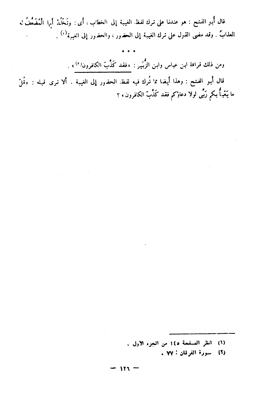 قال أبو الفتح: وهذا أيضا مما ترك فيه لفظ الحضور إلى الغيبة، ألا ترى قبله: "قُلْ مَا يَعْبَأُ بِكُمْ رَبِّي لَوْلا دُعَاؤُكُمْ فَقَدْ كَذَّبَ الكافرون"؟