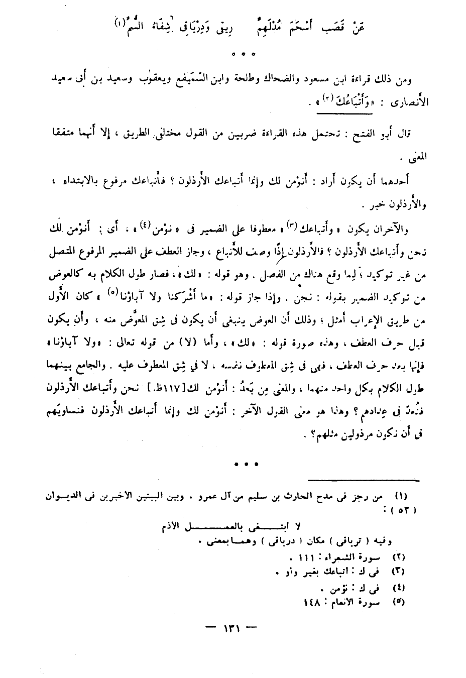 والآخران يكون "وأتباعك"3 معطوفا على الضمير في "نؤمن"4، أي: أنؤمنُ لك نحن وأتباعك الأرذلون؟ فالأرذلون إذًا وصف للأتباع، وجاز العطف على الضمير المرفوع المتصل من غير توكيد؛ لما وقع هناك من الفصل. وهو قوله: "لك"، فصار طول الكلام به كالعوض من توكيد الضمير بقوله: نحن. وإذا جاز قوله: "ما أشْرَكْنا ولا آباؤنا"5 كان الأول من طريق الإعراب أمثل؛ وذلك أن العوض ينبغي أن يكون في شق المعوض منه، وأن يكون قبل حرف العطف، وهذه صورة قوله: "لك"، وأما "لا" من قوله تعالى: "وَلا آبَاؤُنَا"5 فإنها حرف العطف، فهي في شق المعطوف نفسه، لا في شق المعطوف عليه. والجامع بينهما طول الكلام بكل واحد منهما، والمعنى من بعد: أنؤمن لك [117ظ] نحن وأتباعك الأرذلون فنعدُّ في عدادهم؟ وهذا هو معنى القول الآخر: أنؤمن لك وإنما أتباعك الأرذلون فنساويهم في أن نكون مرذولين مثلهم؟.