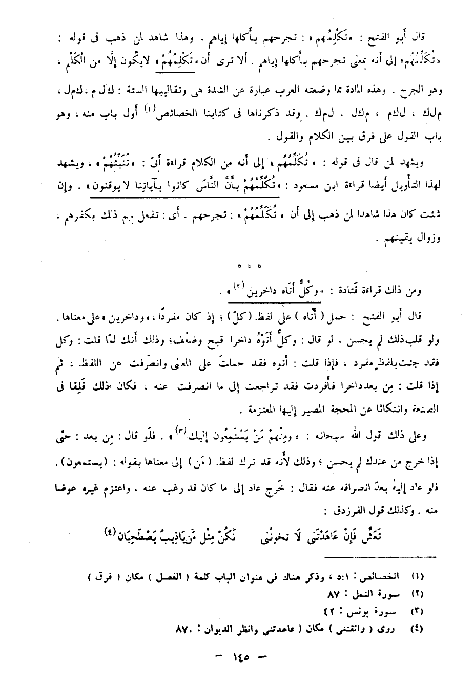 قال أبو الفتح: "تَكْلِمُهُمْ": تجرحهم بأكلها إياهم، وهذا شاهد لمن ذهب في قوله "تُكَلِّمُهُمْ" إلى أنه بمعنى تجرحهم بأكلها إياهم. ألا ترى أن "تَكْلِمُهُمْ" لا يكون من الكَلْم وهو الجرح. وهذه المادة مما وضعته العرب عبارة عن الشدة هي وتقاليبها الستة: ك ل م، ك م ل، م ل ك، ل ك م، م ك ل، ل م ك. وقد ذكرناها في كتابنا الخصائص1 أول باب منه، وهو باب القول على فرق بين الكلام والقول.