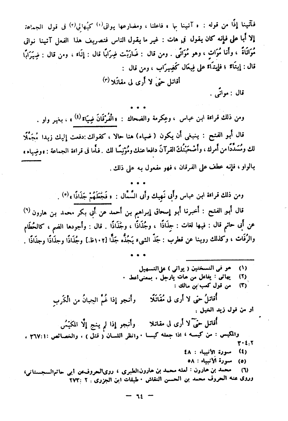 ومن ذلك قراءة ابن عباس، وعكرمة والضحاك: "الْفُرْقَانَ ضِيَاءً"4، بغير واو.