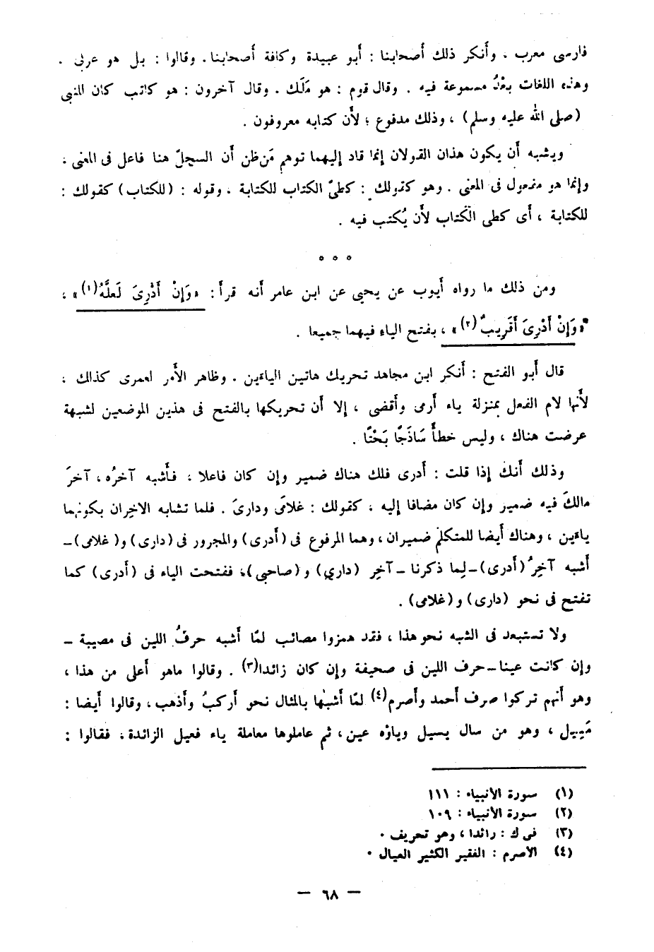 ومن ذلك ما رواه أيوب عن يحيى عن ابن عامر أنه قرأ: "وَإِنْ أَدْرِيَ لَعَلَّه"1، "وَإِنْ أَدْرِيَ أَقرِيبٌ"2، بفتح الياء فيهما جميعا.