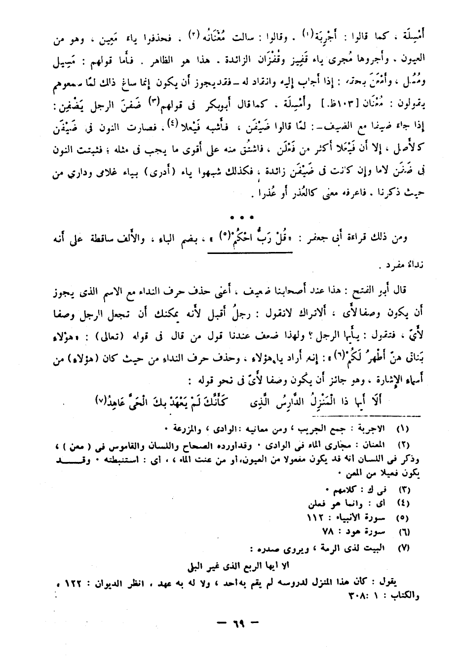قال أبو الفتح: هذا عند أصحابنا ضعيف، أعني حذف حرف النداء مع الاسم الذي يجوز أن يكون وصفا لأي. ألا تراك لا تقول: رجل أقبل؛ لأنه يمكنك أن تجعل الرجل وصفا لأي. فتقول: يأيها الرجل؟ ولهذا ضعف عندنا قول من قال في قوله "تعالى": {هَؤُلاءِ بَنَاتِي هُنَّ أَطْهَرُ لَكُمْ} 6: إنه أراد يا هؤلاء. وحذف حرف النداء من حيث كان "هؤلاء" من أسماء الإشارة، وهو جائز أن يكون وصفا لأي في نحو قوله: