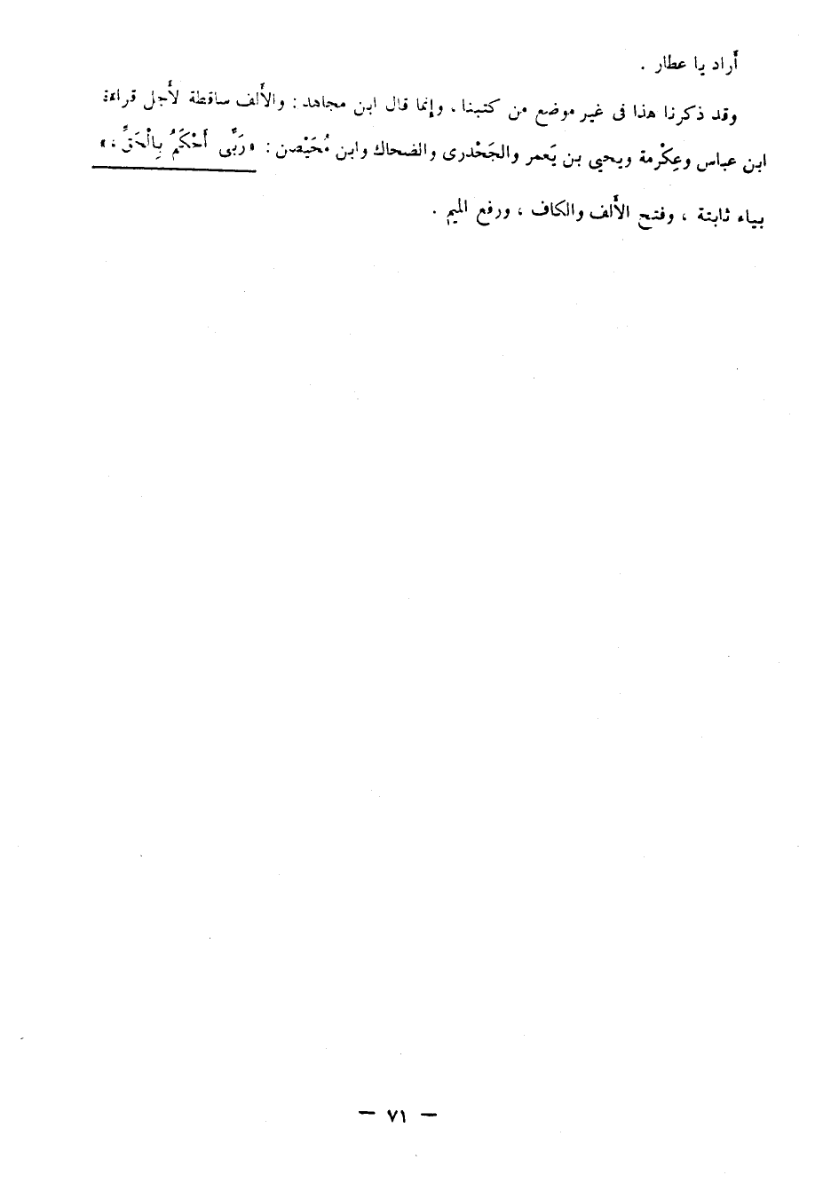 وقد ذكرنا هذا في غير موضع من كتبنا، وإنما قال ابن مجاهد: والألف ساقطة لأجل قراءة ابن عباس وعكرمة ويحيى بن يعمر والجحدري والضحاك وابن محيصن: "رَبِّي احْكُمْ بِالْحَقِّ" بياء ثابتة، وفتح الألف والكاف، ورفع الميم.