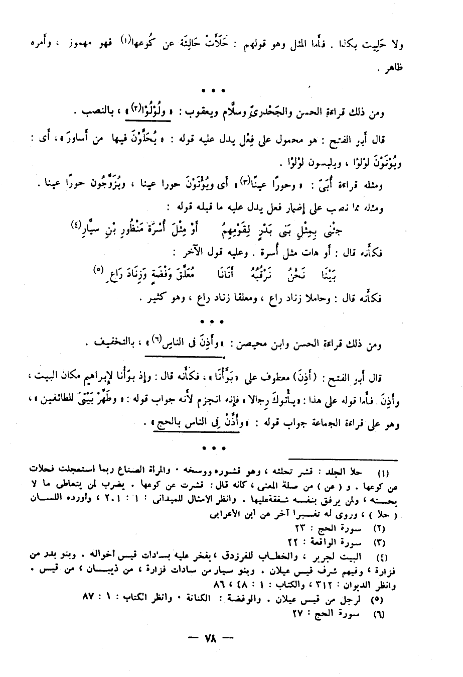 قال أبو الفتح: "أَذِنَ" معطوف على "بَوَّأْنَا"، فكأنه قال: وإذ بوأنا لإبراهيم مكان البيت، وأذن، فأما قوله على هذا: {يَأْتُوكَ رِجَالًا} فإنه انجزم لأنه جواب قوله: {وَطَهِّرْ بَيْتِيَ لِلطَّائِفِينَ} ، وهو على قراءة الجماعة جواب قوله: {وَأَذِّنْ فِي النَّاسِ بِالْحَجِّ} .