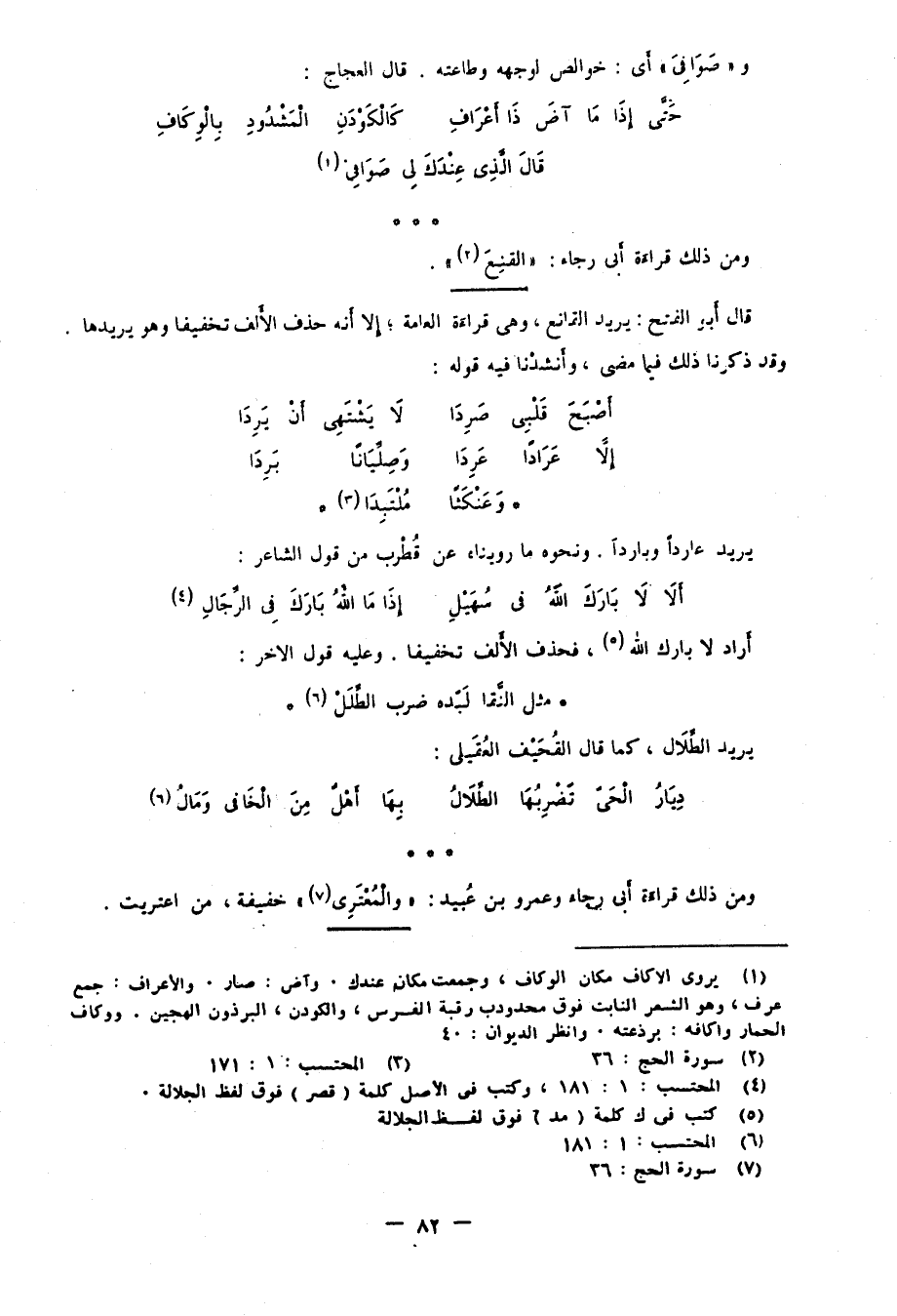 قال أبو الفتح: يريد "القانع"، وهي قراءة العامة، إلا أنه حذف الألف تخفيفا وهو يريدها وقد ذكرنا ذلك فيما مضى، وأنشدنا فيه قوله: