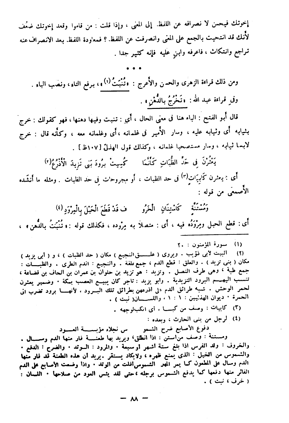 قال أبو الفتح: الباء هنا في معنى الحال، أي: تنبت وفيها دهنها، فهو كقولك: خرج بثيابه. أي وثيابه عليه، وسار الأمير في غلمانه، أي وغلمانه معه، وكأنه قال: خرج لابسا ثيابه، وسار مستصحبا غلمانه، وكذلك قول الهذلي [107ظ] .