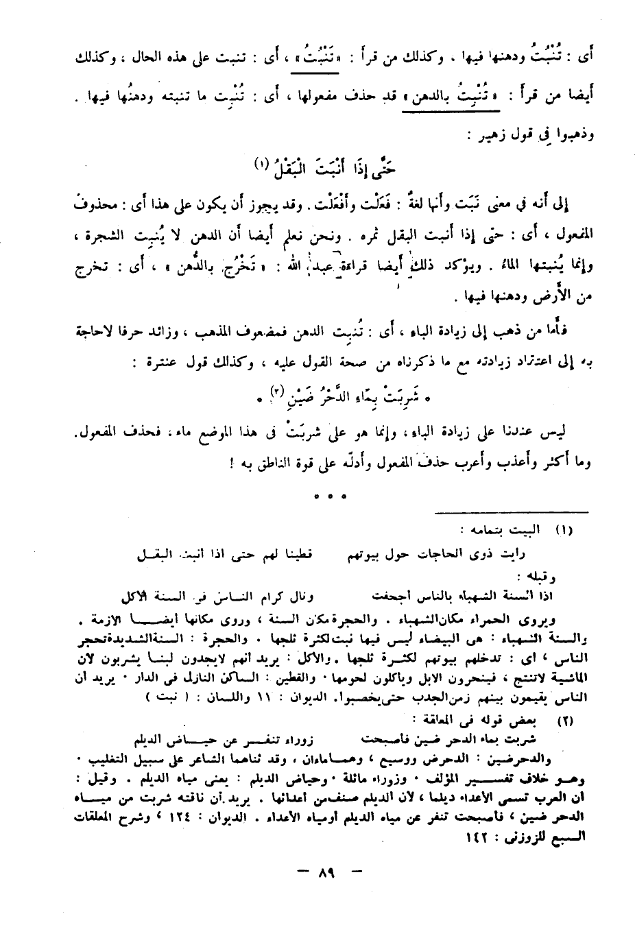 أي: تنْبُتُ ودهنها فيها، وكذلك من قرأ: "تَنْبُتُ"، أي: تنبت على هذه الحال، وكذلك أيضا من قرأ: "تَنْبِتُ بِالدُّهْنِ" قد حذف مفعولها، أي: تنبت ما تنبته ودهنها فيها وذهبوا في قول زهير:
