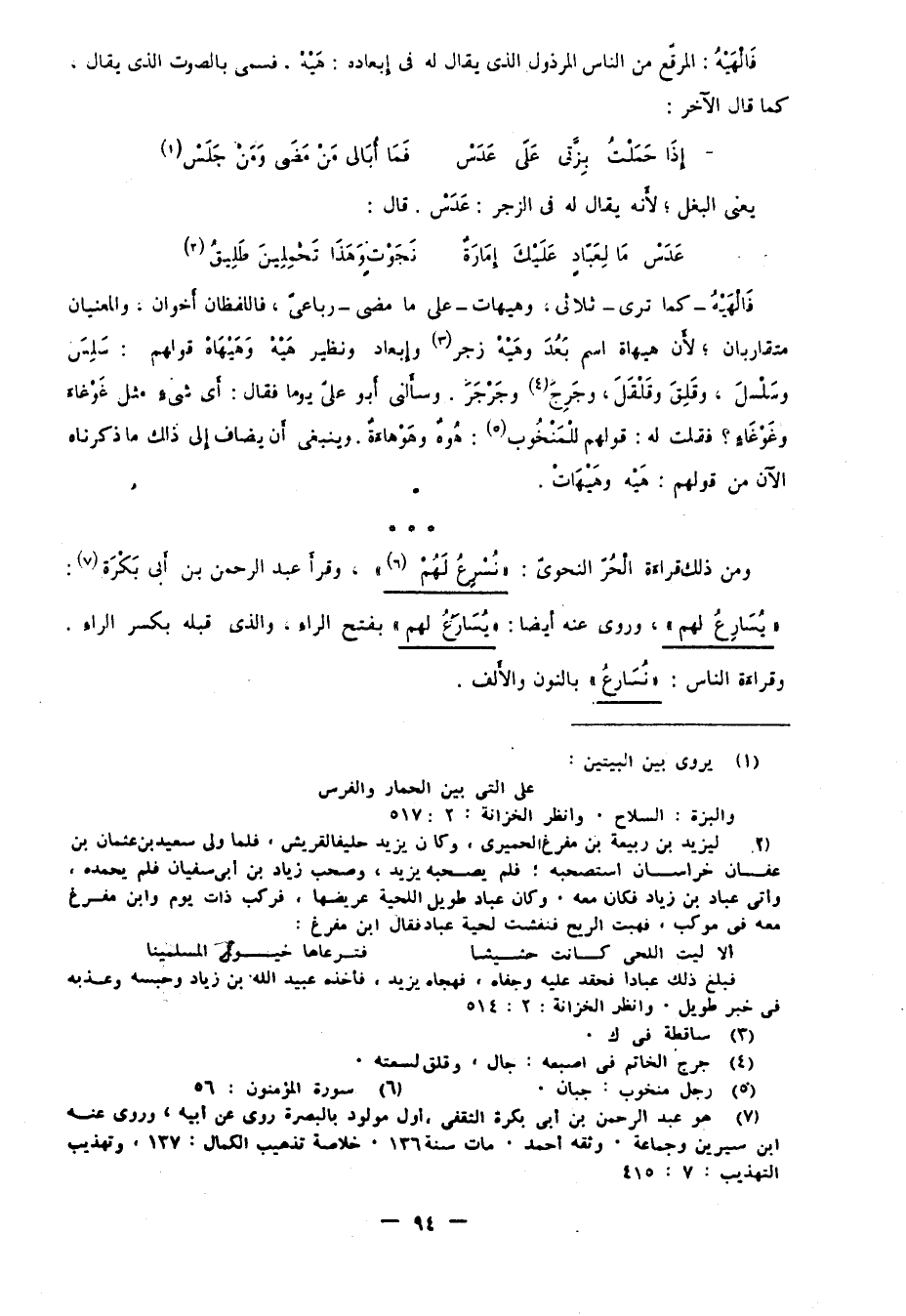 فَالْهَيْهُ -كما ترى- ثلاثي، وهيهات -على ما مضى- رباعي، فاللفظان أخوان، والمعنيان متقاربان؛ لأن هيهاة اسم بَعُدَ وهَيْهْ زجرٌ3 وإبعادٌ ونظير هَيْهْ وهَيْهَاهْ قولهم: سَلِسَ وسَلْسَلَ، وقَلِقَ وقَلْقَلَ، وجَرِجَ4 وجَرْجَرَ. وسألني أبو علي يوما فقال: أي شيء مثل غَوْغاء وغَوْغَاء؟ فقلت له: قولهم للمنخوب5: هُوهٌ وهَوْهَاءةٌ. وينبغي أن يضاف إلى ذلك ما ذكرناه الآن من قولهم: هَيْه وهَيْهَاتْ.