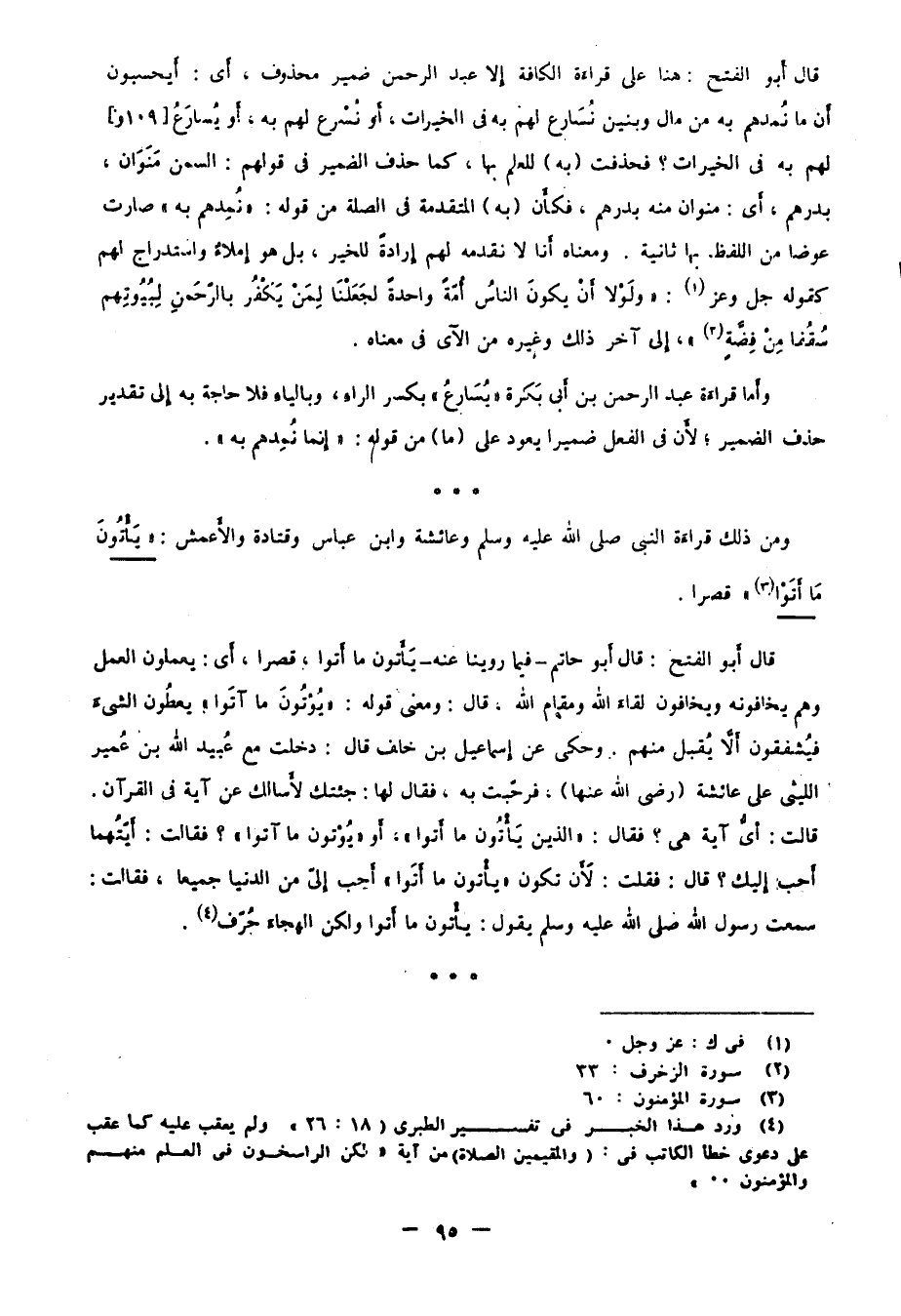 قال أبو الفتح: قال أبو حاتم -فيما روينا عنه- يأتون ما أتوا، قصرا، أي: يعملون العمل وهم يخالفونه ويخافون لقاء الله ومقام الله، قال: ومعنى قوله: {يُؤْتُونَ مَا آتَوْا} يعطون الشيء فيشفقون ألا يقبل منهم. وحُكي عن إسماعيل بن خلف قال: دخلت مع عبيد الله بن عمير الليثي على عائشة "رضي الله عنه"، فرحبت به، فقال لها: جئتك لأسالك عن آية في القرآن. قالت: أي آية هي؟ فقال: "َالَّذِينَ يَأتُونَ مَا أَتَوْا"، أو {يُؤْتُونَ مَا آتَوْا} ؟ فقالت: أيتهما أحب إليك؟ قال: فقلت: لأن تكون "يَأتُونَ مَا أَتَوْا" أحب إلي من الدنيا جميعا، فقالت: سمعت رسول الله صلى الله عليه وسلم يقول: "يأتون ما أتوا" ولكن الهجاءَ حُرّف4.