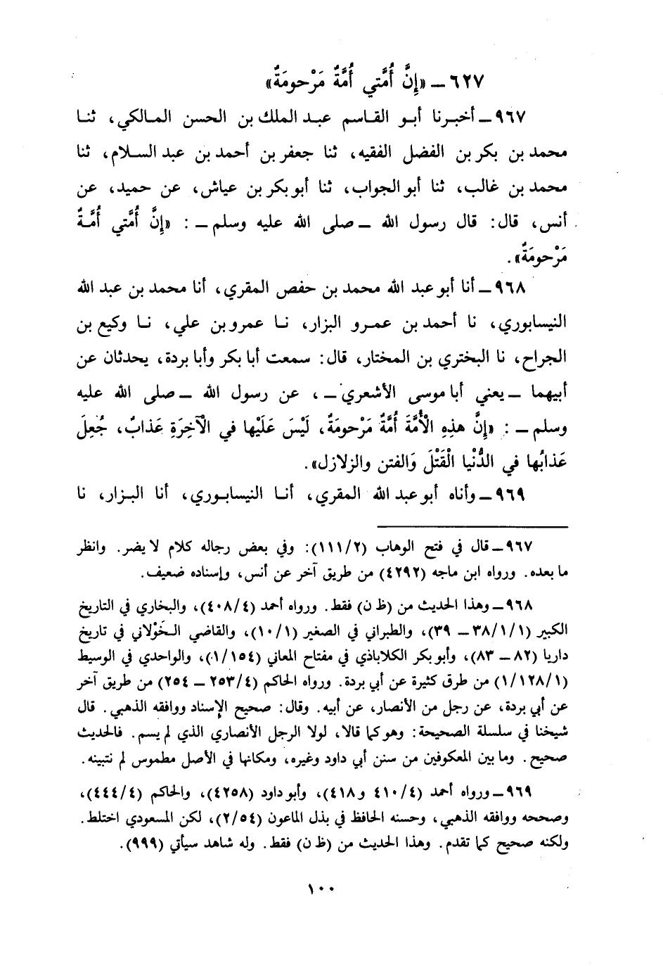 969 - وَأَنَاهُ أَبُو عَبْدِ اللَّهِ الْمُقْرِئُ أنا النَّيْسَابُورِيُّ، أنا الْبَزَّارُ، نا عَمْرُو بْنُ عَلِيٍّ، نا مُعَاذُ بْنُ مُعَاذٍ، نا الْمَسْعُودِيُّ، عَنْ سَعِيدِ بْنِ أَبِي بُرْدَةَ، عَنْ أَبِيهِ، عَنْ أَبِي مُوسَى، أَنَّ رَسُولَ اللَّهِ صَلَّى اللهُ عَلَيْهِ وَسَلَّمَ قَالَ: «§أُمَّتِي أُمَّةٌ مَرْحُومَةٌ، لَيْسَ عَلَيْهَا فِي الْآخِرَةِ عَذَابٌ، إِنَّمَا عَذَابُهَا فِي الدُّنْيَا الزَّلَازِلُ وَالْقَتْلُ»