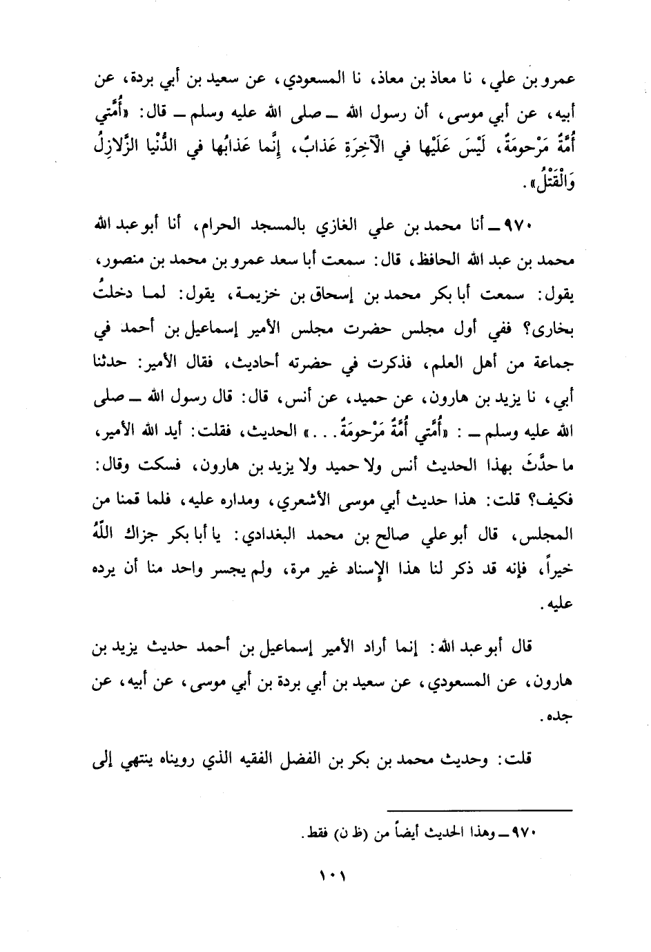 970 - أنا مُحَمَّدُ بْنُ عَلِيٍّ الْغَازِي، بِالْمَسْجِدِ الْحَرَامِ، أنا أَبُو عَبْدِ اللَّهِ، مُحَمَّدُ بْنُ عَبْدِ اللَّهِ الْحَافِظُ قَالَ: سَمِعْتُ أَبَا سَعْدٍ، عَمْرَو بْنَ مُحَمَّدِ بْنِ مَنْصُورٍ يَقُولُ: سَمِعْتُ أَبَا بَكْرٍ، مُحَمَّدَ بْنَ إِسْحَاقَ بْنِ خُزَيْمَةَ يَقُولُ: لَمَّا دَخَلْتُ بُخَارَى فَفِي أَوَّلِ مَجْلِسٍ حَضَرْتُ مَجْلِسَ الْأَمِيرِ إِسْمَاعِيلَ بْنِ أَحْمَدَ فِي جَمَاعَةٍ مِنْ أَهْلِ الْعِلْمِ، فَذَكَرْتُ فِي حَضْرَتِهِ أَحَادِيثَ، فَقَالَ الْأَمِيرُ: حَدَّثَنَا أَبِي، نا يَزِيدُ بْنُ هَارُونَ، عَنْ حُمَيْدٍ، عَنْ أَنَسٍ قَالَ: قَالَ رَسُولُ اللَّهِ صَلَّى اللهُ عَلَيْهِ وَسَلَّمَ: «§أُمَّتِي أُمَّةٌ مَرْحُومَةٌ. . .» ، الْحَدِيثَ، فَقُلْتُ: أَيَّدَ اللَّهُ الْأَمِيرَ، مَا حَدَّثَ بِهَذَا الْحَدِيثِ أَنَسٌ وَلَا حُمَيْدٌ وَلَا يَزِيدُ بْنُ هَارُونَ، فَسَكَتَ وَقَالَ: فَكَيْفَ؟ قُلْتُ: هَذَا حَدِيثُ أَبِي مُوسَى الْأَشْعَرِيِّ، وَمَدَارُهُ عَلَيْهِ، فَلَمَّا قُمْنَا مِنَ الْمَجْلِسِ قَالَ أَبُو عَلِيٍّ صَالِحُ بْنُ مُحَمَّدٍ الْبَغْدَادِيُّ: يَا أَبَا بَكْرٍ جَزَاكَ اللَّهُ خَيْرًا، فَإِنَّهُ قَدْ ذَكَرَ لَنَا هَذَا الْإِسْنَادَ غَيْرَ مَرَّةٍ، وَلَمْ يَجْسُرْ وَاحِدٌ مِنَّا أَنْ يَرُدَّهُ عَلَيْهِ، قَالَ أَبُو عَبْدِ اللَّهِ: إِنَّمَا أَرَادَ الْأَمِيرُ إِسْمَاعِيلُ بْنُ أَحْمَدَ حَدِيثَ يَزِيدَ بْنِ هَارُونَ عَنِ الْمَسْعُودِيِّ عَنْ سَعِيدِ بْنِ أَبِي بُرْدَةَ بْنِ أَبِي مُوسَى عَنْ أَبِيهِ عَنْ جَدِّهِ قُلْتُ وَحَدِيثُ مُحَمَّدِ بْنِ بَكْرِ بْنِ الْفَضْلِ الْفَقِيهِ الَّذِي رُوِّينَاهُ يَنْتَهِي إِلَى حُمَيْدٍ عَنْ أَنَسٍ، وَهَذَا حَدِيثٌ خَرَّجَهُ شَيْخُنَا أَبُو مُحَمَّدٍ عَبْدُ الْغَنِيِّ فِي كِتَابٍ جَمَعَ فِيهِ الصَّحِيحَ مِنْ حَدِيثِ مُحَمَّدِ بْنِ بَكْرٍ عَلَى شَرْطِ صَحِيحَيْ مُسْلِمٍ وَالْبُخَارِيِّ، فَأَمَّا حَدِيثُ الْمَسْعُودِيِّ فَقَدْ رُوِّينَاهُ مِنْ طَرِيقِ الْبَزَّارِ