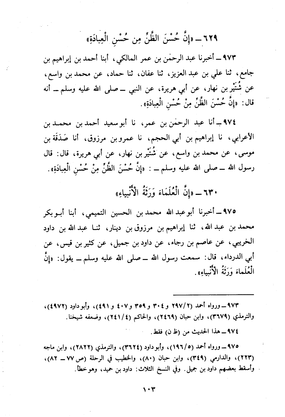 973 - أَخْبَرَنَا عَبْدُ الرَّحْمَنِ بْنُ عُمَرَ الْمَالِكِيُّ، أبنا أَحْمَدُ بْنُ إِبْرَاهِيمَ بْنِ جَامِعٍ، ثنا عَلِيُّ بْنُ عَبْدِ الْعَزِيزِ، ثنا عَفَّانُ، ثنا حَمَّادٌ، عَنْ مُحَمَّدِ بْنِ وَاسِعٍ، عَنْ شُتَيْرِ بْنِ نَهَارٍ، عَنْ أَبِي هُرَيْرَةَ، عَنِ النَّبِيِّ صَلَّى اللهُ عَلَيْهِ وَسَلَّمَ أَنَّهُ قَالَ: §«إِنَّ حُسْنَ الظَّنِّ مِنْ حُسْنِ الْعِبَادَةِ»