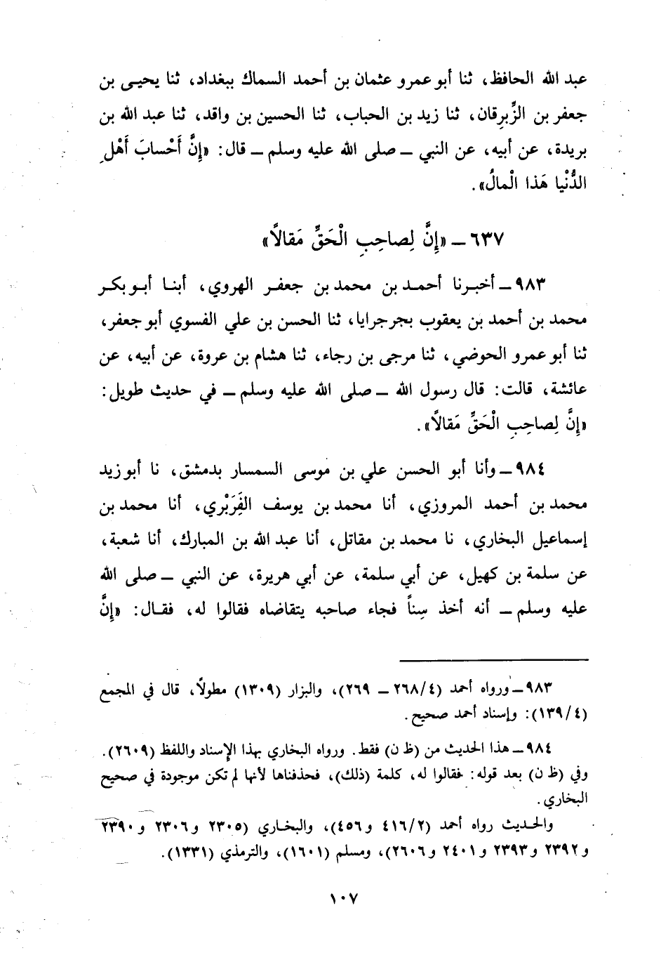983 - أَخْبَرَنَا أَحْمَدُ بْنُ مُحَمَّدِ بْنِ جَعْفَرٍ الْهَرَوِيُّ، أبنا أَبُو بَكْرٍ، مُحَمَّدُ بْنُ أَحْمَدَ بْنِ يَعْقُوبَ بِجُرْجُرَايَا، ثنا الْحَسَنُ بْنُ عَلِيٍّ الْفَسَوِيُّ أَبُو جَعْفَرٍ، ثنا أَبُو عَمْرٍو الْحَوْضِيُّ، ثنا مُرَجَّى بْنُ رَجَاءٍ، ثنا هِشَامُ بْنُ عُرْوَةَ، عَنْ أَبِيهِ، عَنْ عَائِشَةَ، قَالَتْ: قَالَ رَسُولُ اللَّهِ صَلَّى اللهُ عَلَيْهِ وَسَلَّمَ فِي حَدِيثٍ طَوِيلٍ: §«إِنَّ لِصَاحِبِ الْحَقِّ مَقَالًا»