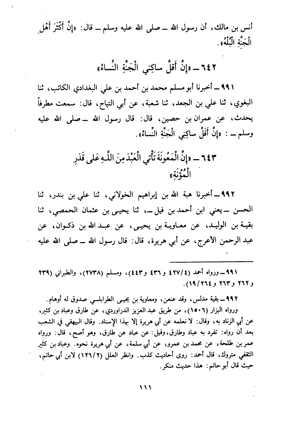 991 - أَخْبَرَنَا أَبُو مُسْلِمٍ، مُحَمَّدُ بْنُ أَحْمَدَ بْنِ عَلِيٍّ الْبَغْدَادِيُّ الْكَاتِبُ، ثنا الْبَغَوِيُّ، ثنا عَلِيُّ بْنُ الْجَعْدِ، ثنا شُعْبَةُ، عَنْ أَبِي التَّيَّاحِ، قَالَ: سَمِعْتُ مُطَرِّفًا، يُحَدِّثُ عَنْ عِمْرَانَ بْنِ حُصَيْنٍ، قَالَ: قَالَ رَسُولُ اللَّهِ صَلَّى اللهُ عَلَيْهِ وَسَلَّمَ: §«إِنَّ أَقَلَّ سَاكِنِي الْجَنَّةِ النِّسَاءَ»