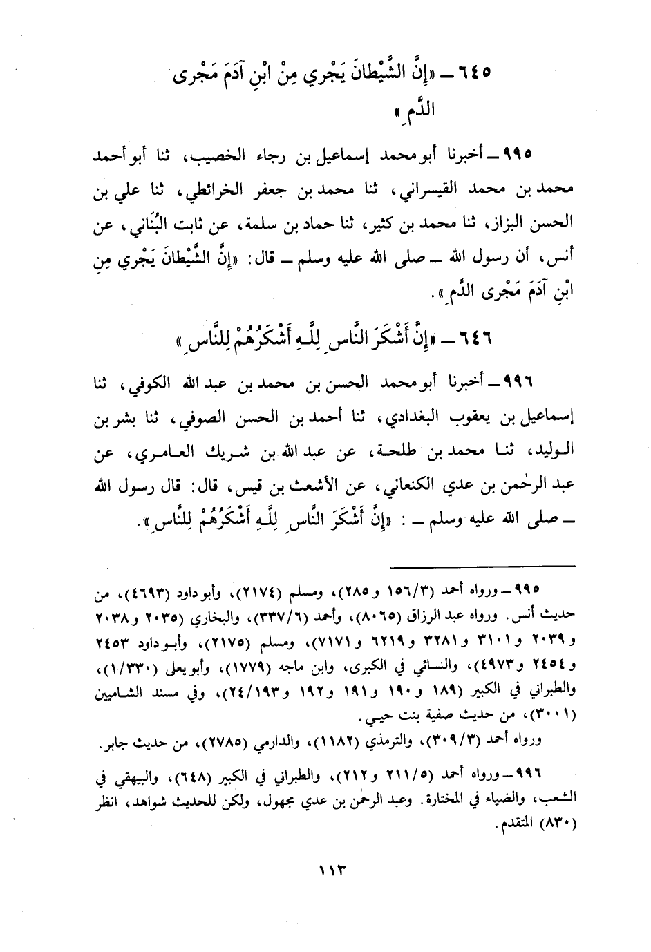 995 - أَخْبَرَنَا أَبُو مُحَمَّدٍ إِسْمَاعِيلُ بْنُ رَجَاءٍ الْخَصِيبُ، ثنا أَبُو أَحْمَدَ مُحَمَّدُ بْنُ مُحَمَّدٍ الْقَيْسَرَانِيُّ، ثنا مُحَمَّدُ بْنُ جَعْفَرٍ الْخَرَائِطِيُّ، ثنا عَلِيُّ بْنُ الْحَسَنِ الْبَزَّازُ، ثنا مُحَمَّدُ بْنُ كَثِيرٍ، ثنا حَمَّادُ بْنُ سَلَمَةَ، عَنْ ثَابِتٍ الْبُنَانِيِّ، عَنْ أَنَسٍ، أَنَّ رَسُولَ اللَّهِ صَلَّى اللهُ عَلَيْهِ وَسَلَّمَ قَالَ: §«إِنَّ الشَّيْطَانَ يَجْرِي مِنَ ابْنِ آدَمَ مَجْرَى الدَّمِ»