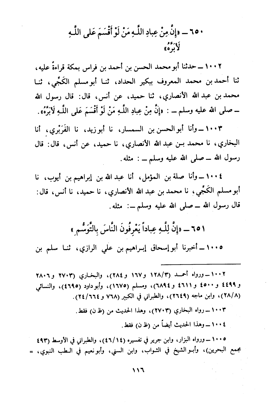 1002 - حَدَّثَنَا أَبُو مُحَمَّدٍ الْحَسَنُ بْنُ أَحْمَدَ بْنِ فِرَاسٍ، بِمَكَّةَ قِرَاءَةً عَلَيْهِ، ثنا أَحْمَدُ بْنُ مُحَمَّدٍ الْمَعْرُوفُ بِبُكَيْرٍ الْحَدَّادِ، ثنا أَبُو مُسْلِمٍ الْكَجِّيُّ، ثنا مُحَمَّدُ بْنُ عَبْدِ اللَّهِ الْأَنْصَارِيُّ، ثنا حُمَيْدٌ، عَنْ أَنَسٍ، قَالَ: قَالَ رَسُولُ اللَّهِ صَلَّى اللهُ عَلَيْهِ وَسَلَّمَ: §«إِنَّ مِنْ عَبَّادِ اللَّهِ مَنْ لَوْ أَقْسَمَ عَلَى اللَّهِ لَأَبَرَّهُ»
