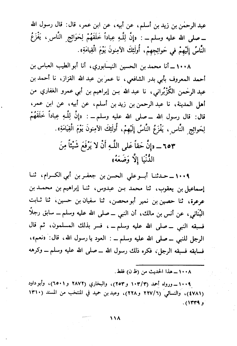 1008 - أنا مُحَمَّدُ بْنُ الْحُسَيْنِ النَّيْسَابُورِيُّ، أنا أَبُو الطَّيِّبِ الْعَبَّاسُ بْنُ أَحْمَدَ الْمَعْرُوفُ بِأَبِي بَدْرٍ الشَّافِعِيِّ، نا عُمَرُ بْنُ عَبْدِ اللَّهِ الْقَزَّازُ، نا أَحْمَدُ بْنُ عَبْدِ الرَّحْمَنِ الْكَزْبَرَانِيُّ، نا عَبْدُ اللَّهِ بْنُ إِبْرَاهِيمَ بْنِ أَبِي عَمْرٍو الْغِفَارِيُّ، مِنْ أَهْلِ الْمَدِينَةِ، نا عَبْدُ الرَّحْمَنِ بْنُ زَيْدِ بْنِ أَسْلَمَ، عَنْ أَبِيهِ، عَنِ ابْنِ عُمَرَ، قَالَ: قَالَ رَسُولُ اللَّهِ صَلَّى اللهُ عَلَيْهِ وَسَلَّمَ: «§إِنَّ لِلَّهِ عِبَادًا خَلَقَهُمْ لِحَوَائِجِ النَّاسِ، يَفْزَعُ النَّاسُ إِلَيْهِمْ، أُولَئِكَ الْآمِنُونَ يَوْمَ الْقِيَامَةِ»