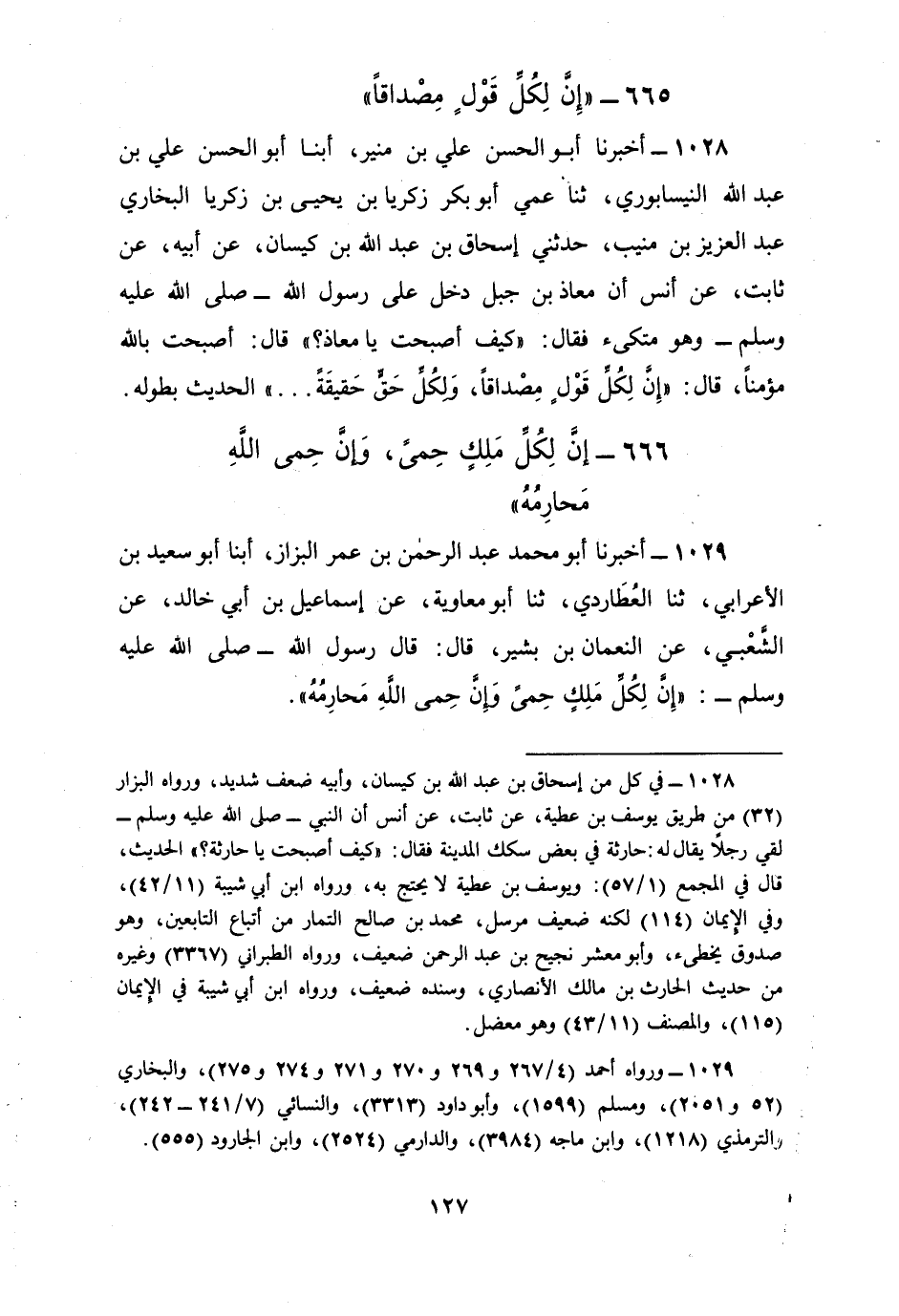 1029 - أَخْبَرَنَا أَبُو مُحَمَّدٍ عَبْدُ الرَّحْمَنِ بْنُ عُمَرَ الْبَزَّازُ، أبنا أَبُو سَعِيدِ بْنُ الْأَعْرَابِيِّ، ثنا الْعُطَارِدِيُّ، ثنا أَبُو مُعَاوِيَةَ، عَنْ إِسْمَاعِيلَ بْنِ أَبِي خَالِدٍ، عَنِ الشَّعْبِيِّ، عَنِ النُّعْمَانِ بْنِ بَشِيرٍ، قَالَ: قَالَ رَسُولُ اللَّهِ صَلَّى اللهُ عَلَيْهِ وَسَلَّمَ: §«إِنَّ لِكُلِّ مَلِكٍ حِمًى، وَإِنَّ حِمَى اللَّهِ مَحَارِمُهُ»