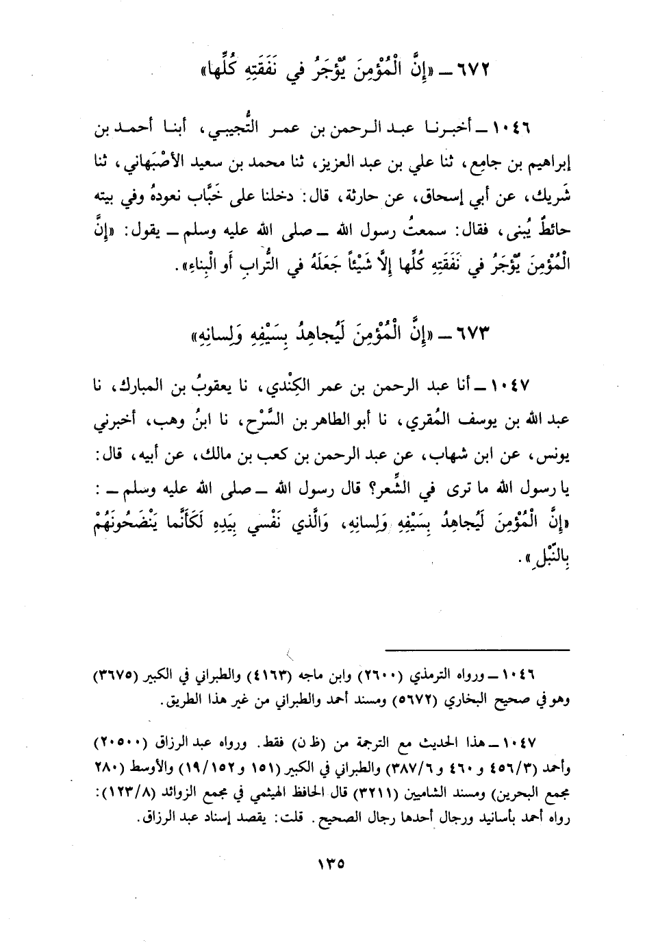 1047 - أنا عَبْدُ الرَّحْمَنِ بْنُ عُمَرَ الْكِنْدِيُّ، نا يَعْقُوبُ بْنُ الْمُبَارَكِ، نا عَبْدُ اللَّهِ بْنُ يُوسُفَ الْمُقْرِئُ، نا أَبُو الطَّاهِرِ بْنُ السَّرْحِ، نا ابْنُ وَهْبٍ، أَخْبَرَنِي يُونُسُ، عَنِ ابْنِ شِهَابٍ، عَنْ عَبْدِ الرَّحْمَنِ بْنِ كَعْبِ بْنِ مَالِكٍ، عَنْ أَبِيهِ، قَالَ: يَا رَسُولَ اللَّهِ مَا تَرَى فِي الشِّعْرِ؟ قَالَ رَسُولُ اللَّهِ صَلَّى اللهُ عَلَيْهِ وَسَلَّمَ: «§إِنَّ الْمُؤْمِنَ لَيُجَاهِدُ بِسَيْفِهِ وَلِسَانِهِ، وَالَّذِي نَفْسِي بِيَدِهِ لَكَأَنَّمَا يَنْضَحُونَهُمْ بِالنَّبْلِ»