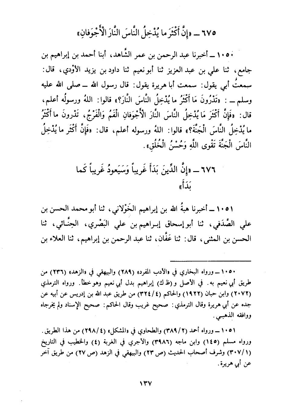 1051 - أَخْبَرَنَا هِبَةُ اللَّهِ بْنُ إِبْرَاهِيمَ الْخَوْلَانِيُّ، ثنا أَبُو مُحَمَّدٍ الْحَسَنُ بْنُ عَلِيٍّ الصَّدَفِيُّ، ثنا أَبُو إِسْحَاقَ، إِبْرَاهِيمُ بْنُ عَلِيٍّ الْبَصْرِيُّ الْحِنَّائِيُّ، ثنا الْحَسَنُ بْنُ الْمُثَنَّى، قَالَ: ثنا عَفَّانُ، ثنا عَبْدُ الرَّحْمَنِ بْنُ إِبْرَاهِيمَ، ثنا الْعَلَاءُ بْنُ عَبْدِ الرَّحْمَنِ، عَنْ أَبِيهِ، عَنْ أَبِي هُرَيْرَةَ، قَالَ: قَالَ رَسُولُ اللَّهِ صَلَّى اللهُ عَلَيْهِ وَسَلَّمَ: «§إِنَّ الدِّينَ بَدَأَ غَرِيبًا وَسَيَعُودُ غَرِيبًا كَمَا بَدَأَ، فَطُوبَى لِلْغُرَبَاءِ»