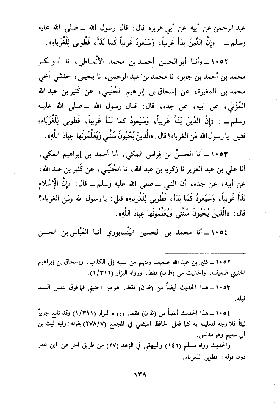1052 - وأنا أَبُو الْحَسَنِ أَحْمَدُ بْنُ مُحَمَّدٍ الْأَنْمَاطِيُّ، نا أَبُو بَكْرٍ مُحَمَّدُ بْنُ أَحْمَدَ بْنِ جَابِرٍ، نا مُحَمَّدُ بْنُ عَبْدِ الرَّحْمَنِ، نا يَحْيَى، حَدَّثَنِي أَخِي مُحَمَّدُ بْنُ الْمُغِيرَةِ، عَنْ إِسْحَاقَ بْنِ إِبْرَاهِيمَ الْحُنَيْنِيِّ، عَنْ كَثِيرِ بْنِ عَبْدِ اللَّهِ الْمُزَنِيِّ، عَنْ أَبِيهِ، عَنْ جَدِّهِ، قَالَ: قَالَ رَسُولُ اللَّهِ صَلَّى اللهُ عَلَيْهِ وَسَلَّمَ: «§إِنَّ الدِّينَ بَدَأَ غَرِيبًا، وَسَيَعُودُ كَمَا بَدَأَ غَرِيبًا، فَطُوبَى لِلْغُرَبَاءِ» ، فَقِيلَ: يَا رَسُولَ اللَّهِ مَنِ الْغُرَبَاءُ؟ قَالَ: «الَّذِينَ يُحْيُونَ سُنَّتِي وَيُعَلِّمُونَهَا عِبَادَ اللَّهِ»