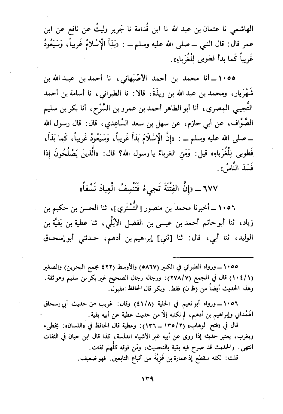 1055 - أنا مُحَمَّدُ بْنُ أَحْمَدَ الْأَصْبَهَانِيُّ، نا أَحْمَدُ بْنُ عَبْدِ اللَّهِ بْنِ شَهْرَيَارَ، وَمُحَمَّدُ بْنُ عَبْدِ اللَّهِ بْنِ رِيذَةَ، قَالَا: نا الطَّبَرَانِيُّ، نا أُسَامَةُ بْنُ أَحْمَدَ التُّجِيبِيُّ الْمِصْرِيُّ، أنا أَبُو الطَّاهِرِ، أَحْمَدُ بْنُ عَمْرِو بْنِ السَّرْحِ، أنا بَكْرُ بْنُ سُلَيْمٍ الصَّوَّافُ، عَنْ أَبِي حَازِمٍ، عَنْ سَهْلِ بْنِ سَعْدٍ السَّاعِدِيِّ، قَالَ: قَالَ رَسُولُ اللَّهِ صَلَّى اللهُ عَلَيْهِ وَسَلَّمَ: «§إِنَّ الْإِسْلَامَ بَدَأَ غَرِيبًا، وَسَيَعُودُ غَرِيبًا كَمَا بَدَأَ، فَطُوبَى لِلْغُرَبَاءِ» ، قِيلَ: وَمَنِ الْغُرَبَاءُ يَا رَسُولَ اللَّهِ؟ قَالَ: «الَّذِينَ يَصْلُحُونَ إِذَا فَسَدَ النَّاسُ»