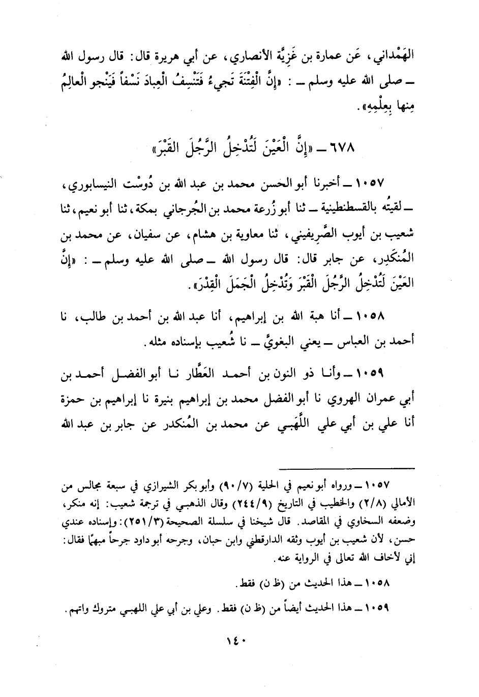 1057 - أَخْبَرَنَا أَبُو الْحَسَنِ، مُحَمَّدُ بْنُ عَبْدِ اللَّهِ بْنِ دُوَسْتَ النَّيْسَابُورِيُّ - لَقِيتُهُ بِالْقُسْطَنْطِينِيَّةِ - ثنا أَبُو زُرْعَةَ، مُحَمَّدُ بْنُ الْجُرْجَانِيِّ بِمَكَّةَ، ثنا أَبُو نُعَيْمٍ، ثنا شُعَيْبُ بْنُ أَيُّوبَ الصَّرِيفِينِيُّ، ثنا مُعَاوِيَةُ بْنُ هِشَامٍ، عَنْ سُفْيَانَ، عَنْ مُحَمَّدِ بْنِ الْمُنْكَدِرِ، عَنْ جَابِرٍ، قَالَ: قَالَ رَسُولُ اللَّهِ صَلَّى اللهُ عَلَيْهِ وَسَلَّمَ: «§إِنَّ الْعَيْنَ لَتُدْخِلُ الرَّجُلَ الْقَبْرَ، وَتُدْخِلُ الْجَمَلَ الْقِدْرَ»
