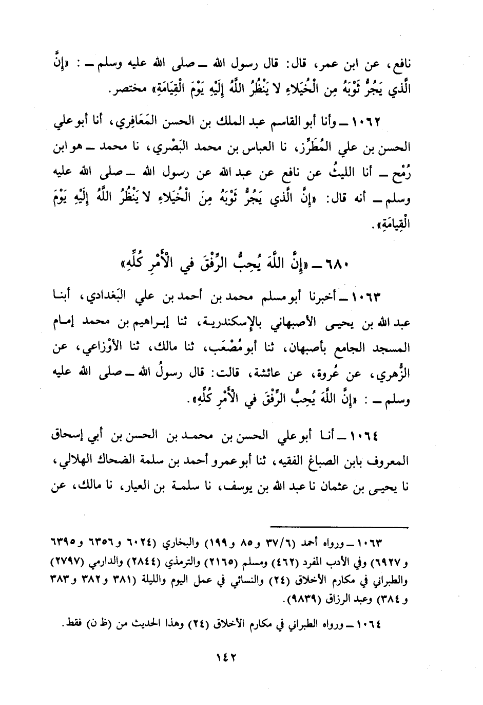 1062 - وأنا أَبُو الْقَاسِمِ عَبْدُ الْمَلِكِ بْنُ الْحَسَنِ الْمَعَافِرِيُّ، أنا أَبُو عَلِيٍّ الْحَسَنُ بْنُ عَلِيٍّ الْمُطَرِّزُ، نا الْعَبَّاسُ بْنُ مُحَمَّدٍ الْبَصْرِيُّ، نا مُحَمَّدٌ، هُوَ ابْنُ رُمْحٍ، أنا اللَّيْثُ، عَنْ نَافِعٍ، عَنْ عَبْدِ اللَّهِ، عَنْ رَسُولِ اللَّهِ صَلَّى اللهُ عَلَيْهِ وَسَلَّمَ أَنَّهُ قَالَ: §«إِنَّ الَّذِي يَجُرُّ ثَوْبَهُ مِنَ الْخُيَلَاءِ لَا يَنْظُرُ اللَّهُ إِلَيْهِ يَوْمَ الْقِيَامَةِ»