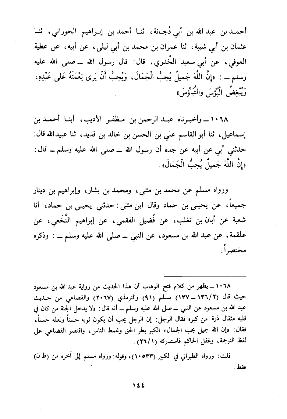 1068 - وَأَخْبَرَنَاهُ عَبْدُ الرَّحْمَنِ بْنُ مُظَفَّرٍ الْأَدِيبُ، أبنا أَحْمَدُ بْنُ إِسْمَاعِيلَ، ثنا أَبُو الْقَاسِمِ، عَلِيُّ بْنُ الْحَسَنِ بْنِ خَالِدِ بْنِ قُدَيْدٍ، ثنا عُبَيْدُ اللَّهِ، قَالَ: حَدَّثَنِي أَبِي، عَنْ أَبِيهِ، عَنْ جَدِّهِ، أَنَّ رَسُولَ اللَّهِ صَلَّى اللهُ عَلَيْهِ وَسَلَّمَ قَالَ: «§إِنَّ اللَّهَ جَمِيلٌ يُحِبُّ الْجَمَالَ» وَرَوَاهُ مُسْلِمٌ، عَنْ مُحَمَّدِ بْنِ مَثْنًى، وَمُحَمَّدِ بْنِ بَشَّارٍ، وَإِبْرَاهِيمَ بْنِ دِينَارٍ، جَمِيعًا عَنْ يَحْيَى بْنِ حَمَّادٍ، وَقَالَ ابْنُ مَثْنًى: حَدَّثَنِي يَحْيَى بْنُ حَمَّادٍ، أَنَا شُعْبَةُ، عَنْ أَبَانَ بْنِ تَغْلِبَ، عَنْ فُضَيْلٍ الْفُقَمِيِّ، عَنْ إِبْرَاهِيمَ النَّخَعِيِّ، عَنْ عَلْقَمَةَ، عَنْ عَبْدِ اللَّهِ بْنِ مَسْعُودٍ، عَنِ النَّبِيِّ صَلَّى اللهُ عَلَيْهِ وَسَلَّمَ، وَذَكَرَهُ مُخْتَصَرًا
