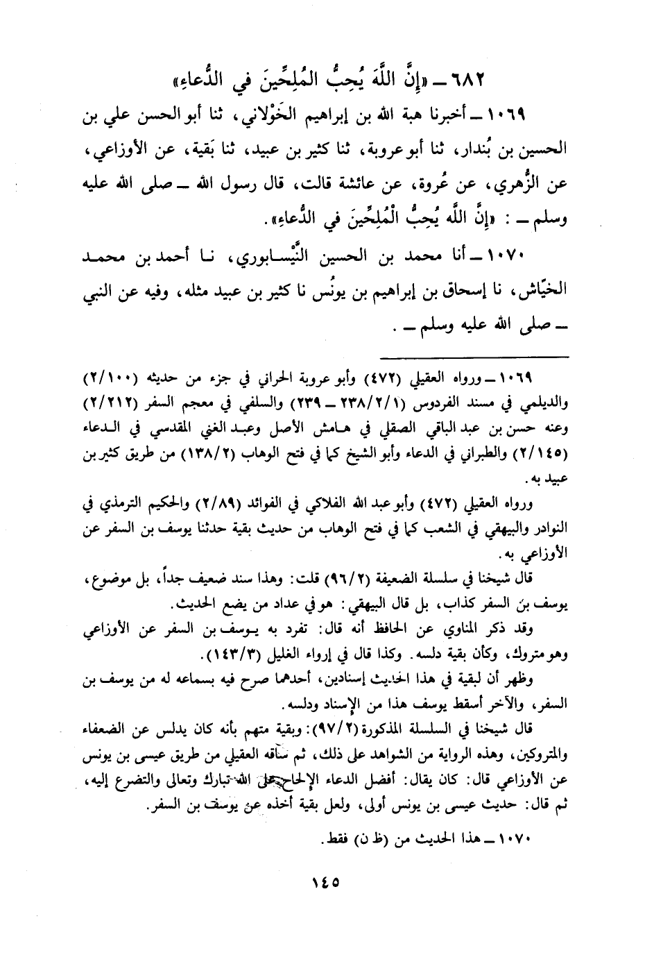 1069 - أَخْبَرَنَا هِبَةُ اللَّهِ بْنُ إِبْرَاهِيمَ الْخَوْلَانِيُّ، ثنا أَبُو الْحَسَنِ، عَلِيُّ بْنُ الْحُسَيْنِ بْنِ بُنْدَارٍ، ثنا أَبُو عَرُوبَةَ، ثنا كَثِيرُ بْنُ عُبَيْدٍ، ثنا بَقِيَّةُ، عَنِ الْأَوْزَاعِيِّ، عَنِ الزُّهْرِيِّ، عَنْ عُرْوَةَ، عَنْ عَائِشَةَ، قَالَتْ: قَالَ رَسُولُ اللَّهِ صَلَّى اللهُ عَلَيْهِ وَسَلَّمَ: §«إِنَّ اللَّهَ يُحِبُّ الْمُلِحِّينَ فِي الدُّعَاءِ»