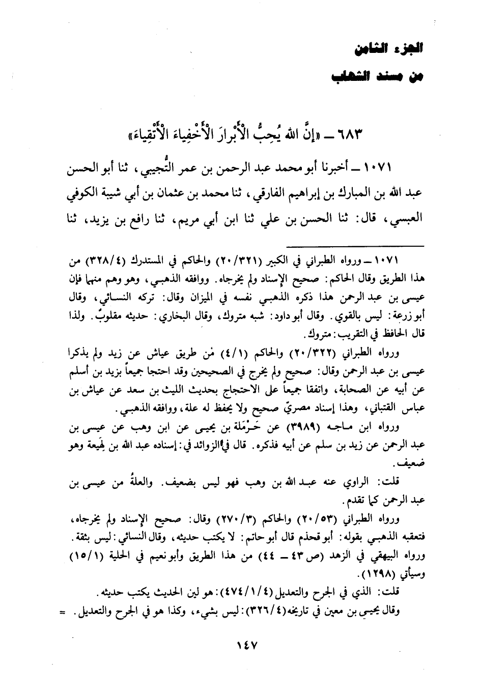 1071 - أَخْبَرَنَا أَبُو مُحَمَّدٍ عَبْدُ الرَّحْمَنِ بْنُ عُمَرَ التُّجِيبِيُّ، ثنا أَبُو الْحَسَنِ عَبْدُ اللَّهِ بْنُ الْمُبَارَكِ بْنِ إِبْرَاهِيمَ الْفَارِقِيُّ، ثنا مُحَمَّدُ بْنُ عُثْمَانَ بْنِ أَبِي شَيْبَةَ الْكُوفِيُّ الْعَبْسِيُّ، قَالَ: ثنا الْحَسَنُ بْنُ عَلِيٍّ، ثنا ابْنُ أَبِي مَرْيَمَ، ثنا رَافِعُ بْنُ يَزِيدَ، ثنا -[148]- عَيَّاشُ بْنُ عَبَّاسٍ، عَنْ عِيسَى بْنِ عَبْدِ الرَّحْمَنِ، عَنْ زَيْدِ بْنِ أَسْلَمَ، عَنْ أَبِيهِ، أَنَّ عُمَرَ بْنَ الْخَطَّابِ، خَرَجَ إِلَى مَسْجِدِ رَسُولِ اللَّهِ صَلَّى اللهُ عَلَيْهِ وَسَلَّمَ، فَإِذَا هُوَ بِمُعَاذِ بْنِ جَبَلٍ يَبْكِي عِنْدَ قَبْرِ رَسُولِ اللَّهِ صَلَّى اللهُ عَلَيْهِ وَسَلَّمَ، فَقَالَ: مَا يُبْكِيكَ يَا مُعَاذُ؟ قَالَ: أَبْكَانِي شَيْءٌ سَمِعْتُهُ مِنْ صَاحِبِ هَذَا الْقَبْرِ، سَمِعْتُهُ يَقُولُ: «§إِنَّ اللَّهَ يُحِبُّ الْأَبْرَارَ الْأَخْفِيَاءَ الْأَتْقِيَاءَ، الَّذِينَ إِذَا غَابُوا لَمْ يُفْتَقَدُوا، وَإِذَا حَضَرُوا لَمْ يُعْرَفُوا، وَلَمْ يُدْعَوْا، قُلُوبُهُمْ مَصَابِيحُ الْهُدَى، يَخْرُجُونَ مِنْ كُلِّ غَبْرَاءَ مُظْلِمَةٍ»
