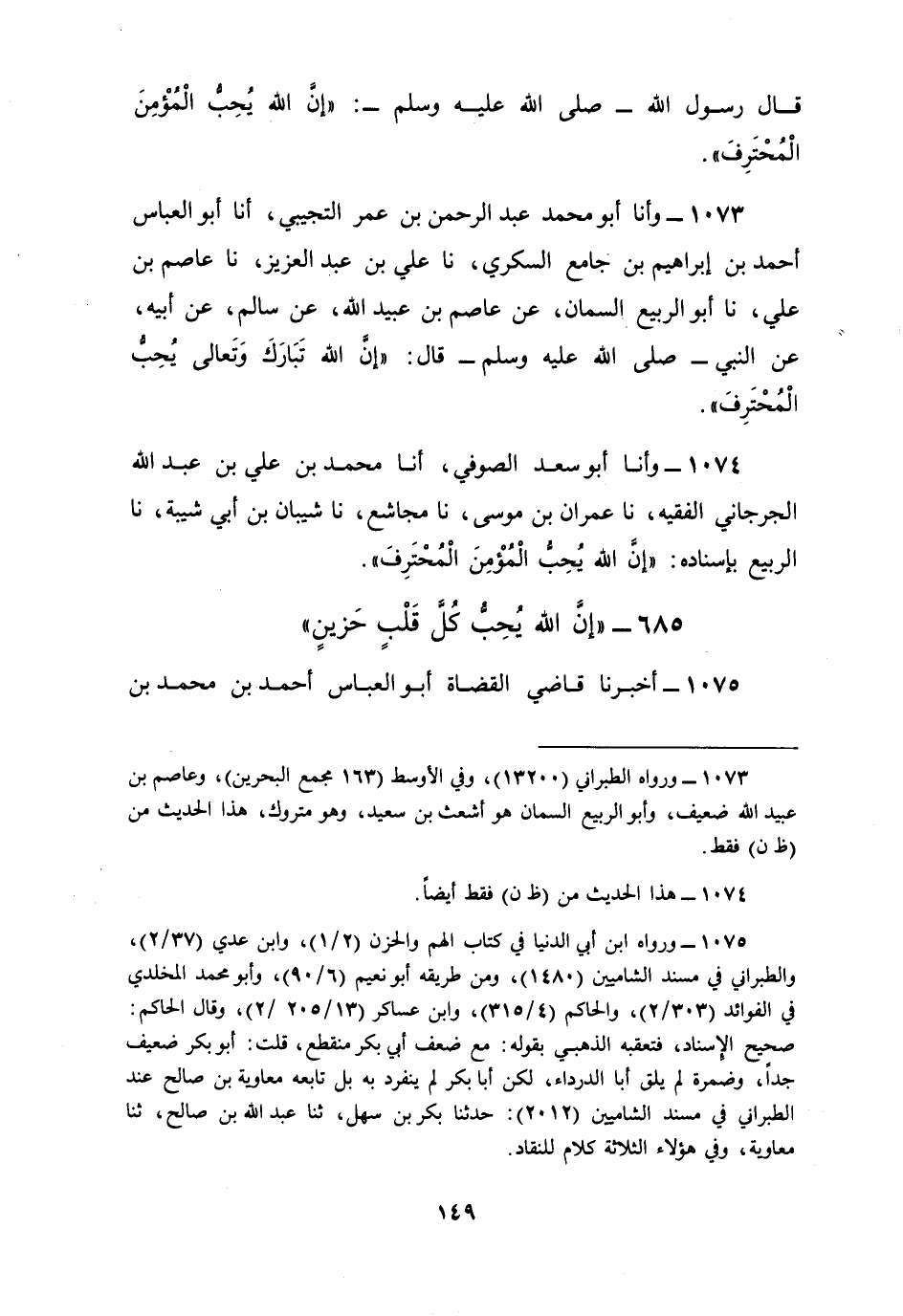 1074 - وأنا أَبُو سَعْدٍ الصُّوفِيُّ، أنا مُحَمَّدُ بْنُ عَلِيِّ بْنِ عَبْدِ اللَّهِ الْجُرْجَانِيُّ الْفَقِيهُ، نا عِمْرَانُ بْنُ مُوسَى، نا مُجَاشِعٌ، نا شَيْبَانُ بْنُ أَبِي شَيْبَةَ، نا الرَّبِيعُ، بِإِسْنَادِهِ: §«إِنَّ اللَّهَ يُحِبُّ الْمُؤْمِنَ الْمُحْتَرِفَ»