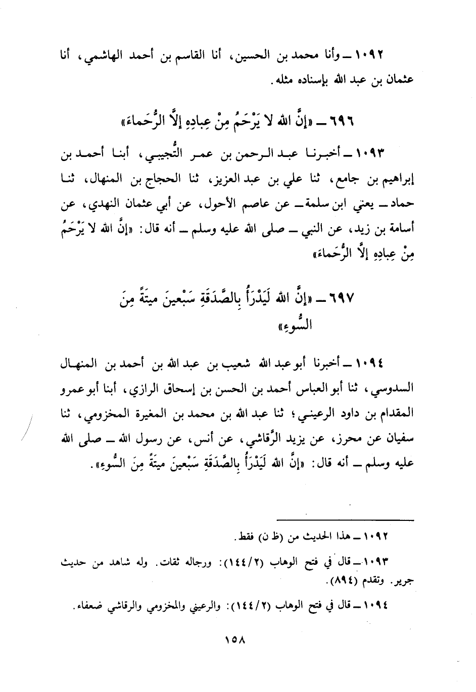 1093 - أَخْبَرَنَا عَبْدُ الرَّحْمَنِ بْنُ عُمَرَ التُّجِيبِيُّ، أبنا أَحْمَدُ بْنُ إِبْرَاهِيمَ بْنِ جَامِعٍ، ثنا عَلِيُّ بْنُ عَبْدِ الْعَزِيزِ، ثنا الْحَجَّاجُ بْنُ الْمِنْهَالِ، ثنا حَمَّادٌ يَعْنِي ابْنَ سَلَمَةَ، عَنْ عَاصِمٍ الْأَحْوَلِ، عَنْ أَبِي عُثْمَانَ النَّهْدِيِّ، عَنْ أُسَامَةَ بْنِ زَيْدٍ، عَنِ النَّبِيِّ صَلَّى اللهُ عَلَيْهِ وَسَلَّمَ أَنَّهُ قَالَ: §«إِنَّ اللَّهَ لَا يَرْحَمُ مِنْ عِبَادِهِ إِلَّا الرُّحَمَاءَ»