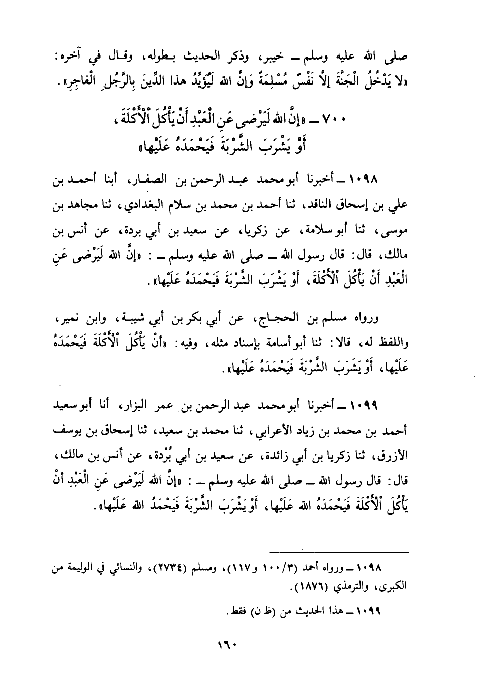1098 - أَخْبَرَنَا أَبُو مُحَمَّدٍ عَبْدُ الرَّحْمَنِ بْنُ الصَّفَّارِ، أبنا أَحْمَدُ بْنُ عَلِيِّ بْنِ إِسْحَاقَ النَّاقِدُ، ثنا أَحْمَدُ بْنُ مُحَمَّدِ بْنِ سَلَّامٍ الْبَغْدَادِيُّ، ثنا مُجَاهِدُ بْنُ مُوسَى، ثنا أَبُو سَلَامَةَ، عَنْ زَكَرِيَّا، عَنْ سَعِيدِ بْنِ أَبِي بُرْدَةَ، عَنْ أَنَسِ بْنِ مَالِكٍ، قَالَ: قَالَ رَسُولُ اللَّهِ صَلَّى اللهُ عَلَيْهِ وَسَلَّمَ: §«إِنَّ اللَّهَ لَيَرْضَى عَنِ الْعَبْدِ أَنْ يَأْكُلَ الْأُكْلَةَ أَوْ يَشْرَبَ الشَّرْبَةَ فَيَحْمَدَهُ عَلَيْهَا» ، وَرَوَاهُ مُسْلِمُ بْنُ الْحَجَّاجِ عَنْ أَبِي بَكْرِ بْنِ أَبِي شَيْبَةَ وَابْنِ نُمَيْرٍ، وَاللَّفْظُ لَهُ، قَالَا: ثَنَا أَبُو أُسَامَةَ بِإِسْنَادٍ مِثْلَهُ، وَفِيهِ «أَنْ يَأْكُلَ الْأُكْلَةَ فَيَحْمَدَهُ عَلَيْهَا، أَوْ يَشْرَبَ الشَّرْبَةَ فَيَحْمَدَهُ عَلَيْهَا»