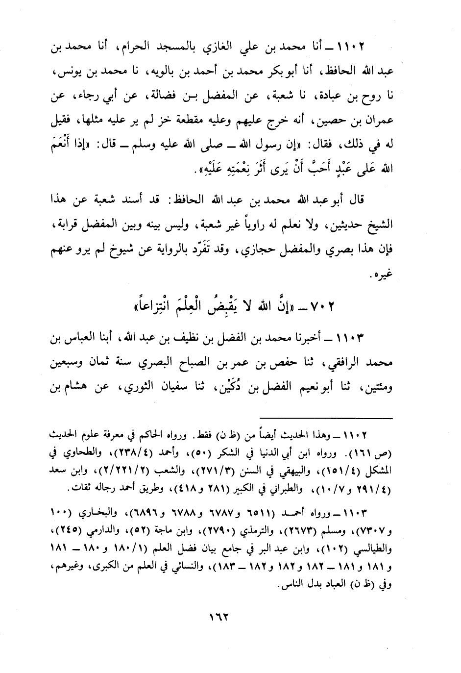 1102 - أنا مُحَمَّدُ بْنُ عَلِيٍّ الْغَازِي، بِالْمَسْجِدِ الْحَرَامِ، أنا مُحَمَّدُ بْنُ عَبْدِ اللَّهِ الْحَافِظُ، أنا أَبُو بَكْرٍ مُحَمَّدُ بْنُ أَحْمَدَ بْنِ بَالَوَيْهِ، نا مُحَمَّدُ بْنُ يُونُسَ، نا رَوْحُ بْنُ عُبَادَةَ، نا شُعْبَةُ، عَنِ الْمُفَضَّلِ بْنِ فَضَالَةَ، عَنْ أَبِي رَجَاءٍ، عَنْ عِمْرَانَ بْنِ حُصَيْنٍ، أَنَّهُ خَرَجَ عَلَيْهِمْ وَعَلَيْهِ مُقَطَّعَةُ خَزٍّ لَمْ يُرَ عَلَيْهِ مِثْلُهَا، فَقِيلَ لَهُ فِي ذَلِكَ، فَقَالَ إِنَّ رَسُولَ اللَّهِ صَلَّى اللهُ عَلَيْهِ وَسَلَّمَ قَالَ: §«إِذَا أَنْعَمَ اللَّهُ عَلَى عَبْدٍ أَحَبَّ أَنْ يَرَى أَثَرَ نِعْمَتَهُ عَلَيْهِ» قَالَ أَبُو عَبْدِ اللَّهِ مُحَمَّدُ بْنُ عَبْدِ اللَّهِ الْحَافِظُ: قَدْ أَسْنَدَ شُعْبَةُ عَنْ هَذَا الشَّيْخِ حَدِيثَيْنِ، وَلَا نَعْلَمُ لَهُ رَاوِيًا غَيْرَ شُعْبَةَ، وَلَيْسَ بَيْنَهُ وَبَيْنَ الْمُفَضَّلِ قَرَابَةٌ، فَإِنَّ هَذَا بَصْرِيٌّ، وَالْمُفَضَّلُ حِجَازِيٌّ، وَقَدْ تَفَرَّدَ بِالرِّوَايَةِ عَنْ شُيُوخٍ لَمْ يَرْوِ عَنْهُمْ غَيْرُهُ