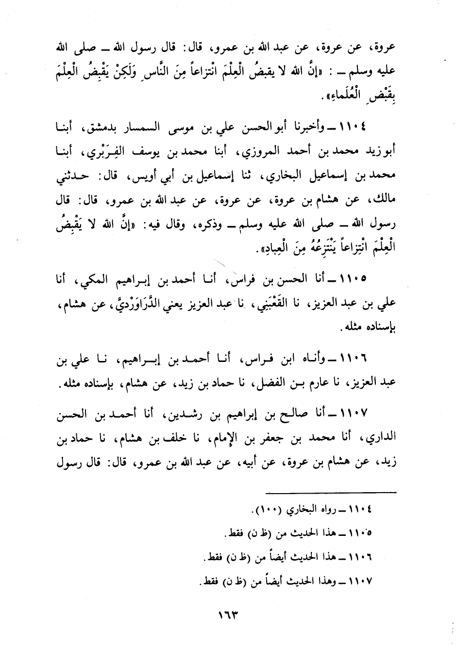 1107 - أنا صَالِحُ بْنُ إِبْرَاهِيمَ بْنِ رِشْدِينَ، أنا أَحْمَدُ بْنُ الْحَسَنِ الدَّارِيُّ، أنا مُحَمَّدُ بْنُ جَعْفَرِ بْنِ الْإِمَامِ، نا خَلَفُ بْنُ هِشَامٍ، نا حَمَّادُ بْنُ زَيْدٍ، عَنْ هِشَامِ بْنِ عُرْوَةَ، عَنْ أَبِيهِ، عَنْ عَبْدِ اللَّهِ بْنِ عَمْرٍو، قَالَ: قَالَ رَسُولُ اللَّهِ صَلَّى اللهُ عَلَيْهِ وَسَلَّمَ: «إِنَّ اللَّهَ §لَا يَقْبِضُ الْعِلْمَ انْتِزَاعًا يَنْتَزِعُهُ مِنَ النَّاسِ، وَلَكِنْ يَقْبِضُ الْعُلَمَاءَ بِعِلْمِهِمْ، فَإِذَا لَمْ يَبْقَ عَالِمٌ اتَّخَذَ النَّاسُ رُؤَسَاءَ جُهَّالًا، فَسُئِلُوا، فَأَفْتَوْا بِغَيْرِ عِلْمٍ، فَضَلُّوا وَأَضَلُّوا»
