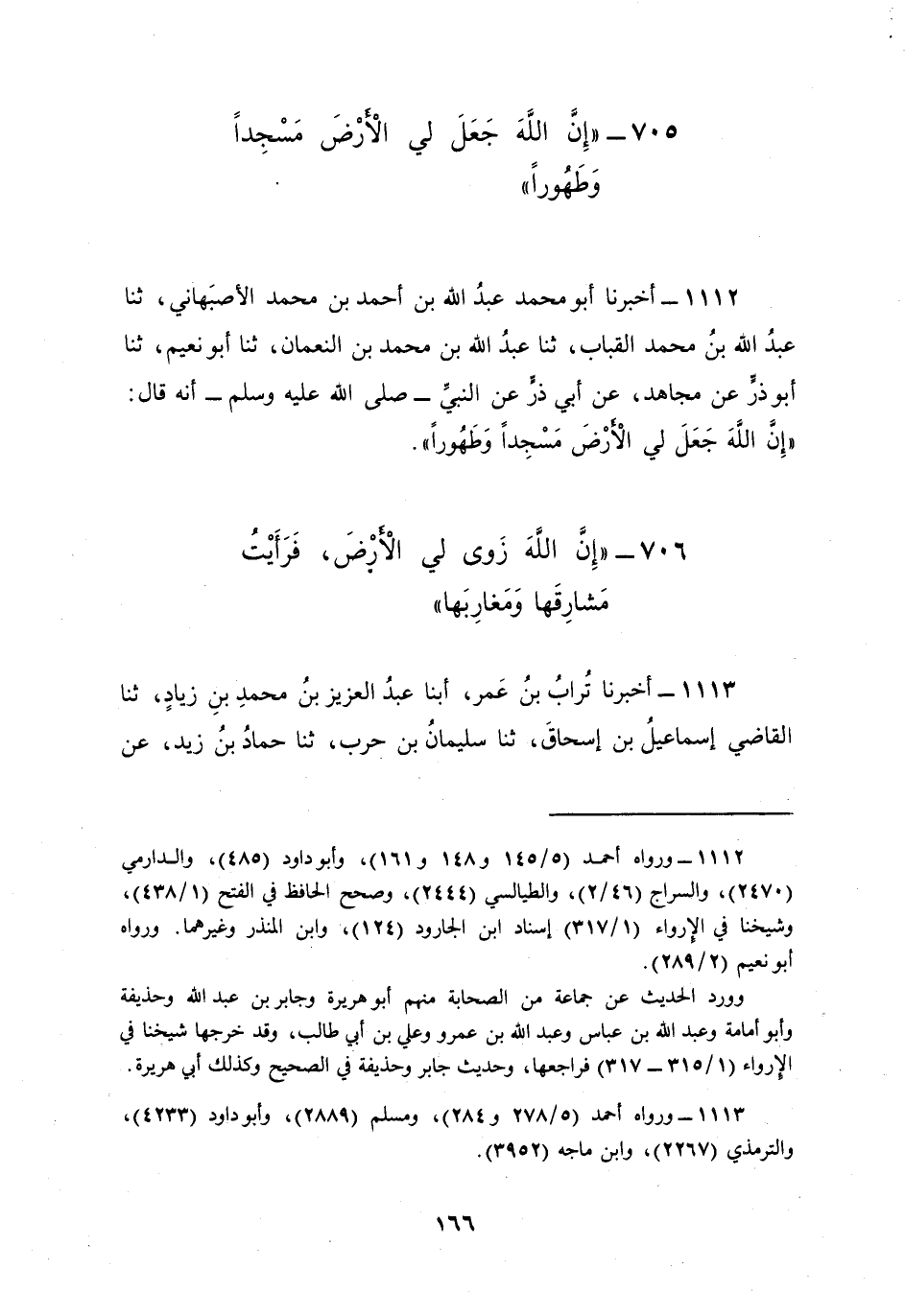 1112 - أَخْبَرَنَا أَبُو مُحَمَّدٍ عَبْدُ اللَّهِ بْنُ أَحْمَدَ بْنِ مُحَمَّدٍ الْأَصْبَهَانِيُّ، ثنا عَبْدُ اللَّهِ بْنُ مُحَمَّدٍ الْقُبَابُ، ثنا عَبْدُ اللَّهِ بْنُ مُحَمَّدِ بْنِ النُّعْمَانِ، ثنا أَبُو نُعَيْمٍ، ثنا أَبُو ذَرٍّ، عَنْ مُجَاهِدٍ، عَنْ أَبِي ذَرٍّ، عَنِ النَّبِيِّ صَلَّى اللهُ عَلَيْهِ وَسَلَّمَ أَنَّهُ قَالَ: §«إِنَّ اللَّهَ جَعَلَ لِي الْأَرْضَ مَسْجِدًا وَطَهُورًا»