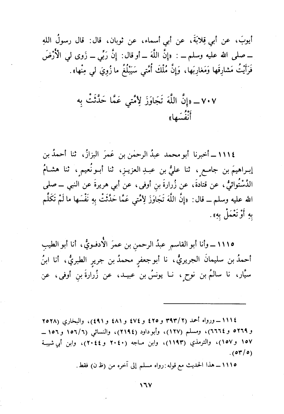 1115 - وأنا أَبُو الْقَاسِمِ عَبْدُ الرَّحْمَنِ بْنُ عُمَرَ الْأُدْفُوِيُّ، أنا أَبُو الطَّيِّبِ، أَحْمَدُ بْنُ سُلَيْمَانَ الْجُرَيْرِيُّ، نا أَبُو جَعْفَرٍ، مُحَمَّدُ بْنُ جَرِيرٍ الطَّبَرِيُّ، أنا ابْنُ سَيَّارٍ، نا سَالِمُ بْنُ نُوحٍ، نا يُونُسُ بْنُ عُبَيْدٍ، عَنْ زُرَارَةَ بْنِ أَوْفَى، عَنْ أَبِي هُرَيْرَةَ، أَنَّ رَسُولَ اللَّهِ صَلَّى اللهُ عَلَيْهِ وَسَلَّمَ قَالَ: «إِنَّ اللَّهَ §تَجَاوَزَ لِأُمَّتِي عَمَّا حَدَّثَتْ بِهِ أَنْفُسَهَا مَا لَمْ تَنْطِقْ بِهِ أَوْ تَعْمَلْ بِهِ» رَوَاهُ مُسْلِمٌ، نَا سَعِيدُ بْنُ مَنْصُورٍ وَقُتَيْبَةُ بْنُ سَعِيدٍ وَمُحَمَّدُ بْنُ عُبَيْدٍ الْغُبَرِيُّ وَاللَّفْظُ لِسَعِيدٍ، نَا أَبُو عَوَانَةَ، عَنْ قَتَادَةَ، عَنْ زُرَارَةَ بْنِ أَوْفَى، عَنْ أَبِي هُرَيْرَةَ، عَنِ النَّبِيِّ عَلَيْهِ السَّلّامُ قَالَ: «إِنَّ اللَّهَ تَجَاوَزَ لِأُمَّتِي عَمَّا حَدَّثَتْ بِهِ أَنْفُسَهَا مَا لَمْ يَتَكَلَّمُوا أَوْ يَعْمَلُوا بِهِ»