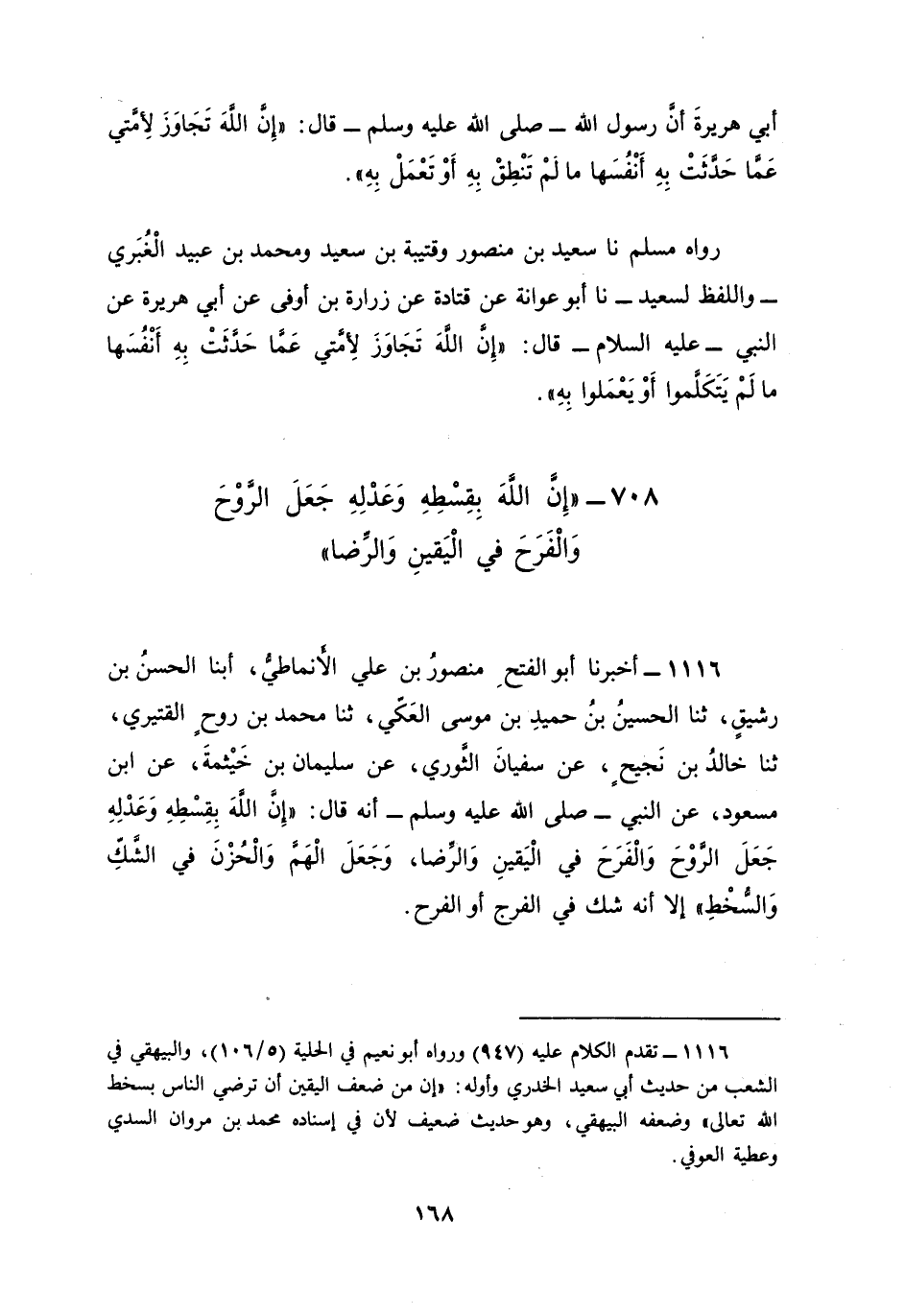 1116 - أَخْبَرَنَا أَبُو الْفَتْحِ، مَنْصُورُ بْنُ عَلِيٍّ الْأَنْمَاطِيُّ، أبنا الْحَسَنُ بْنُ رَشِيقٍ، ثنا الْحُسَيْنُ بْنُ حُمَيْدِ بْنِ مُوسَى الْعَكِّيُّ، ثنا مُحَمَّدُ بْنُ رَوْحٍ الْقَتِيرِيُّ، ثنا خَالِدُ بْنُ نَجِيحٍ، عَنْ سُفْيَانَ الثَّوْرِيِّ، عَنْ سُلَيْمَانَ بْنِ خَيْثَمَةَ، عَنِ ابْنِ مَسْعُودٍ، عَنِ النَّبِيِّ صَلَّى اللهُ عَلَيْهِ وَسَلَّمَ أَنَّهُ قَالَ: «إِنَّ اللَّهَ بِقِسْطِهِ وَعَدْلِهِ §جَعَلَ الرَّوْحَ وَالْفَرَحَ فِي الْيَقِينِ وَالرِّضَا، وَجَعَلَ الْهَمَّ وَالْحَزَنَ فِي الشَّكِّ وَالسُّخَطِ» ، إِلَّا أَنَّهُ شَكَّ فِي الْفَرَجِ أَوِ الْفَرَحِ