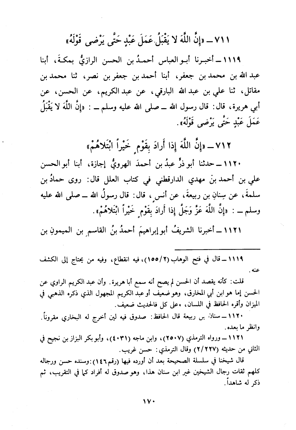 1120 - حَدَّثَنَا أَبُو ذَرٍّ عَبْدُ بْنُ أَحْمَدَ الْهَرَوِيُّ، إِجَازَةً، أبنا أَبُو الْحَسَنِ، عَلِيُّ بْنُ أَحْمَدَ بْنِ مَهْدِيٍّ الدَّارَقُطْنِيُّ فِي كِتَابِ الْعِلَلِ قَالَ: رَوَى حَمَّادُ بْنُ سَلَمَةَ، عَنْ سِنَانِ بْنِ رَبِيعَةَ، عَنْ أَنَسٍ، قَالَ: قَالَ رَسُولُ اللَّهِ صَلَّى اللهُ عَلَيْهِ وَسَلَّمَ: «إِنَّ اللَّهَ §عَزَّ وَجَلَّ إِذَا أَرَادَ بِقَوْمٍ خَيْرًا ابْتَلَاهُمْ»